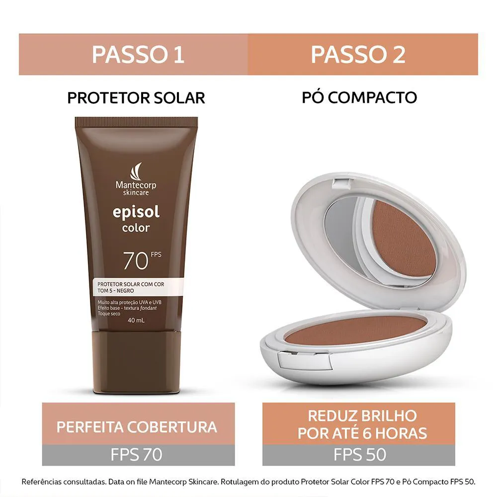 Protetor Solar Facial Mantecorp Episol Color promove perfeita cobertura com efeito natural e uniforme da Pele, com efeito matte, toque seco e sem cheiro de protetor, textura leve e fácil de espalhar e rápida absorção. Possui proteção imediata FPS 70 contra os raios UVA, UVB, infravermelho A e luz visível. Disponível em 6 tonalidades desenvolvido para peles brasileiras. Protege a pele imediatamente após sua aplicação. O uso regular auxilia na prevenção do câncer de pele e de outros efeitos danosos causados pelo sol, como o envelhecimento precoce. Ajuda a prevenir queimaduras solares. Com tecnologia Soft Focus, um sistema inovador de dispersão dos pigmentos minerais, que suaviza as imperfeições e disfarça rugas finas, linhas de expressão e imperfeições da pele sem obstruir os poros. * RESULTADO: Protetor Solar * SUGESTÕES DE USO: 1.Aplique cerca de uma colher de chá para garantir uma proteção completa do rosto e pescoço 30 minutos antes da exposição solar. 2.Espalhe no rosto até cobrir todas as partes dele. 3.Use todos os dias para finalizar a rotina de Cuidados com a Pele pela manhã. * OBSERVAÇÕES: Imagem Meramente Ilustrativa * ITENS INCLUSOS: 1 Mantecorp Episol Color Protetor Solar Facial FPS70 Tom 5 Negro 40ml