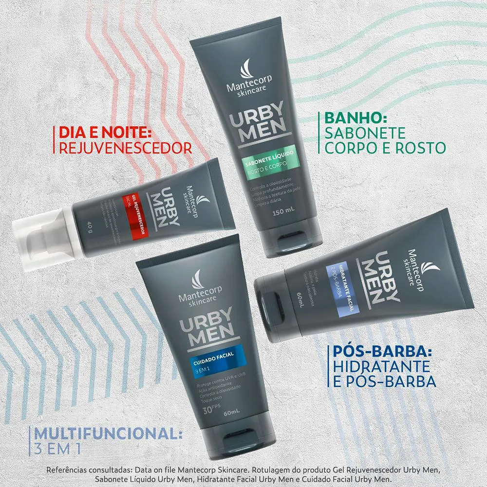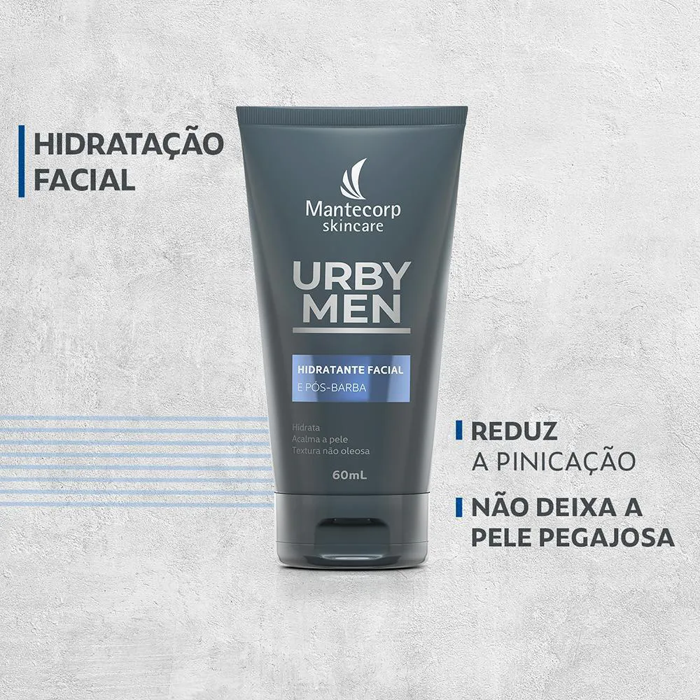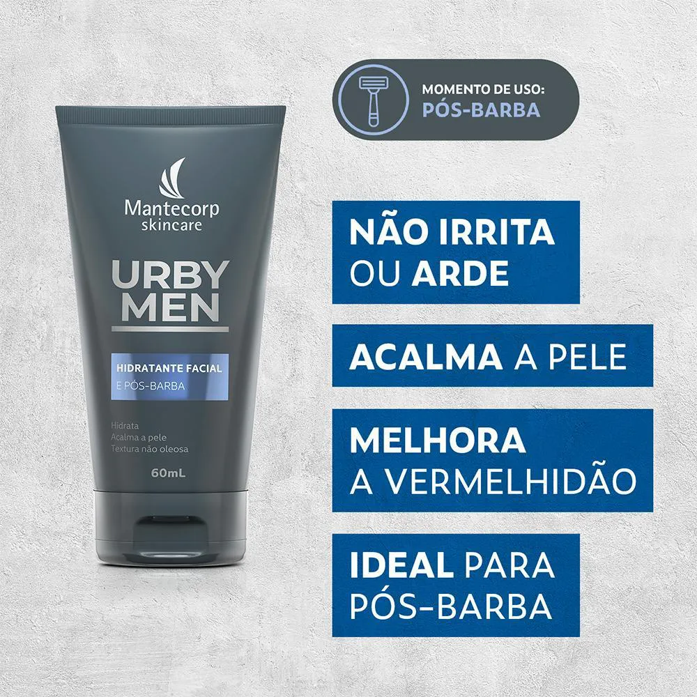 Hidratante Facial e Pós Barba Mantecorp Urby Men contém ação Calmante, além de hidratar e regenerar a Pele. Possui o completo Sens C + Prebióticos e D Pantenol, promovendo conforto imediato e sensação refrescante, melhora descamação, coceira e vermelhidão. * RESULTADO: Pele com aparência saudável. * SUGESTÕES DE USO: