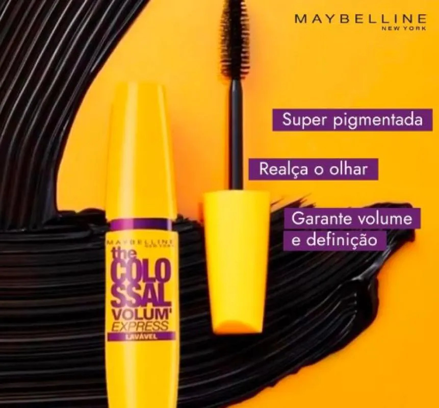 Maybelline The Colossal Volum'Express Lavável Preto Máscara de cílios preta. The Colossal Volum'Express Lavável Preto é bem pigmentada e realça o olhar com fios encorpados e volumosos. Enriquecida com Colágeno e Agentes Espessantes, a Máscara de Cílios The Colossal Volum'Express garante volume e definição aos cílios de longa duração e 9x mais volume! As cerdas de alta tecnologia do The Colossal Maybelline proporcionam curvas sensacionais, máximo volume, e super definição, com apenas uma passada e sem auxílio de curvex. A textura lavável e muito pigmentada, não empelota ou gruda.