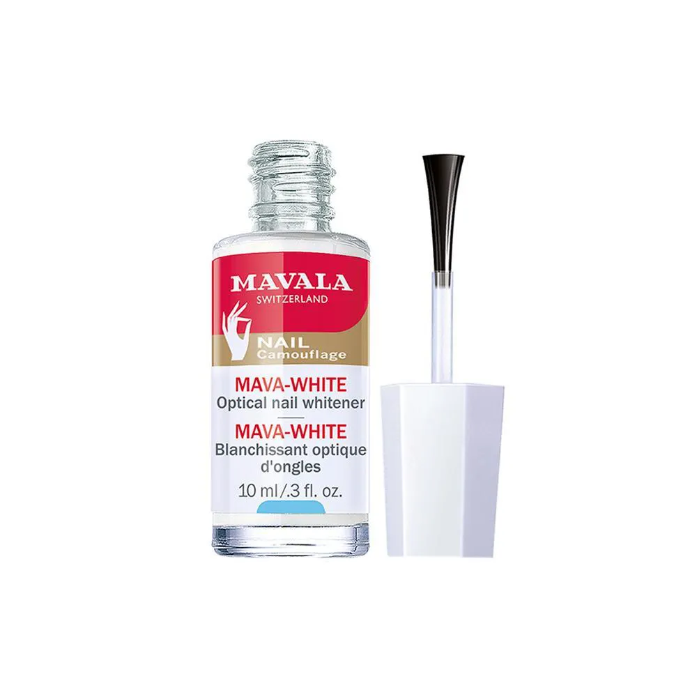 Clareador óptico Vários fatores externos (pigmentos de cores, nicotina, produtos de coloração capilar, etc) podem manchar ou amarelar as unhas. A fórmula inovadora de MAVA-WHITE esconde o amarelado e as manchas devolvendo um aspecto natural e saudável. É um clareador óptico que contém pigmentos que reagem à luz UV. * SUGESTÕES DE USO: 1.Para um efeito mais longo e brilhante, aplicar uma camada fina de Mava-White e um esmalte em seguida;