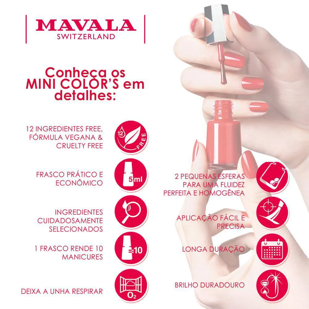 MINI COLORS Linha de esmaltes MAVALA Diferenciais: • Grande variedade de cor para todos os gostos e estilos. • Seu tamanho pequeno é prático de ser mantido e manuseado. • Brilho e durabilidade prolongados. Características importantes: • Sem Formaldeído • Sem Tolueno • Sem Ftalato Sem Xileno • Sem adição de Colofanito • Sem ingredientes de origem animal • Sem metais pesados • Sem conservantes, como Parabeno e outros Sem preocupação, você vai amá-los!!! * RESULTADO:Brilho * SUGESTÕES DE USO:1.Aplique duas camadas finas de esmalte, depois de aplicar uma camada de Base protetora;