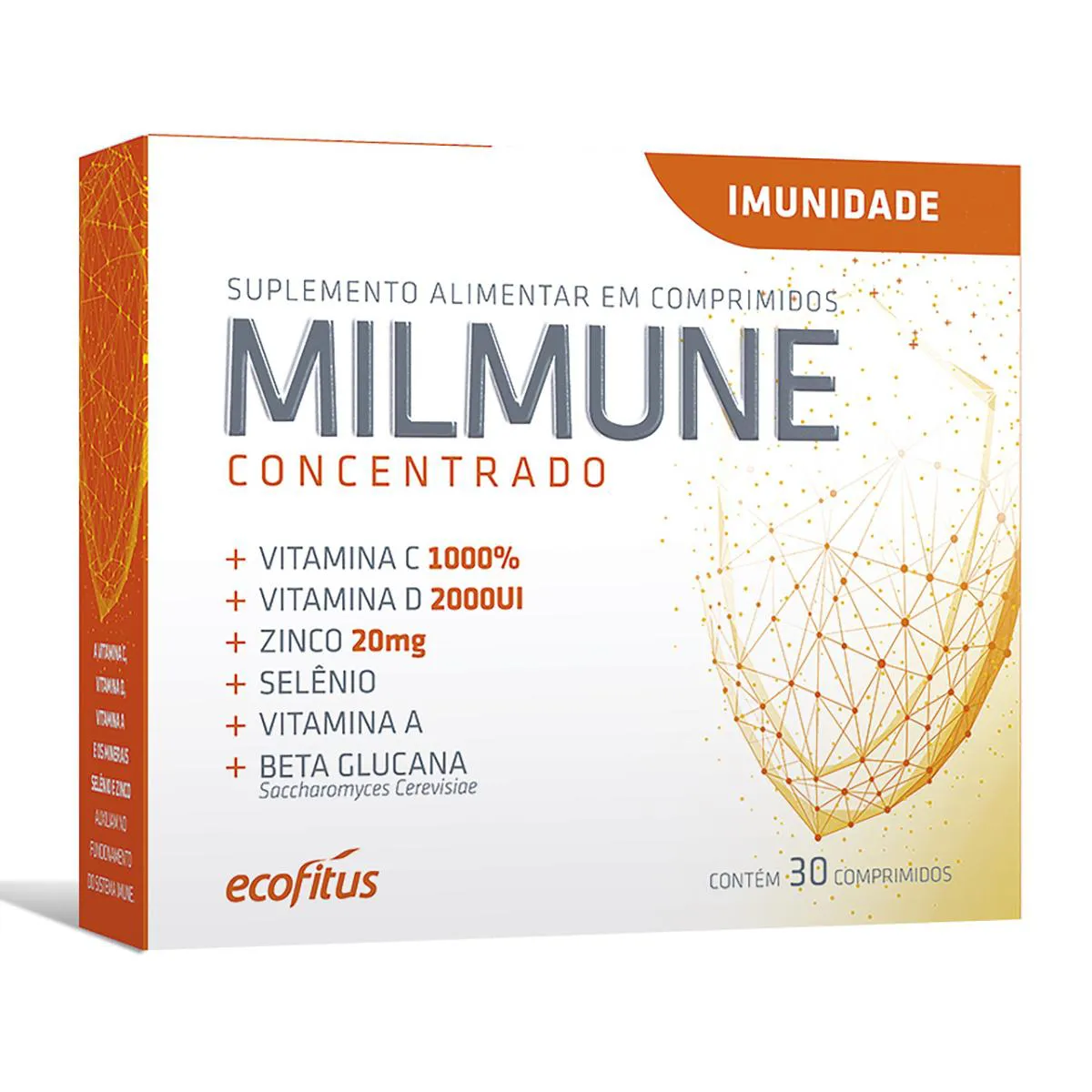 Milmune concentrado é um suplemento alimentar em comprimidos que traz uma fórmula com Beta Glucana, vitamina c, Vitamina D, Vitamina A, Selênio e Zinco.