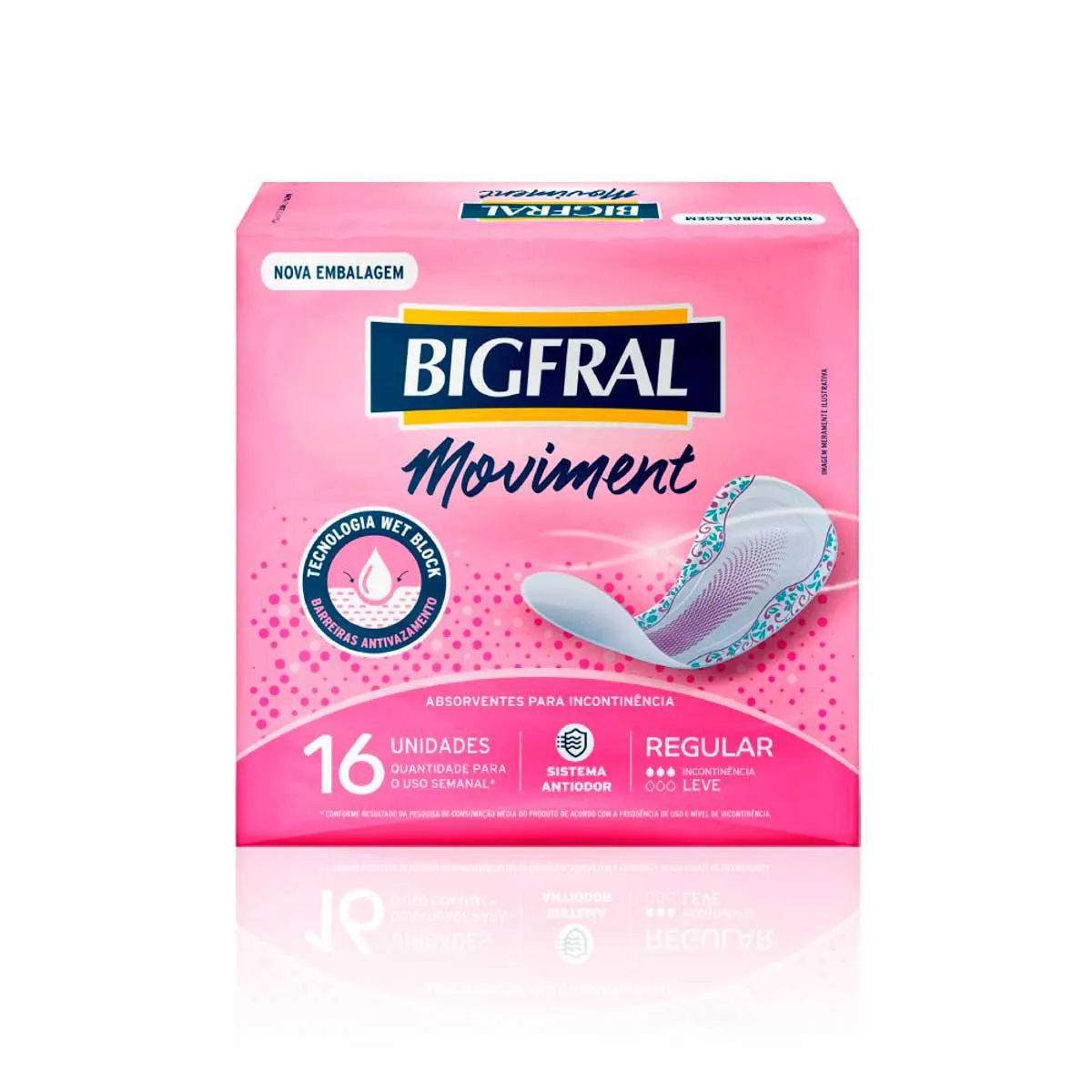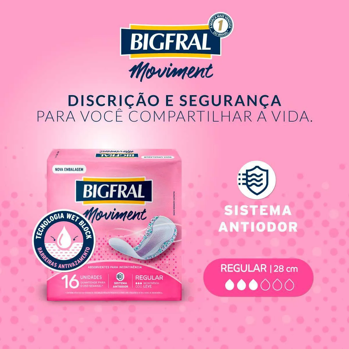 BigFral Moviment Miss Regular é um absorvente feminino indicado para casos de incontinência urinária leve a moderada. Contém gel superabsorvente e tecnologia Wet Block, que absorve o líquido rapidamente (até 6x mais do que o absorvente de uso menstrual), mantendo a região seca e a umidade longe da Pele.
