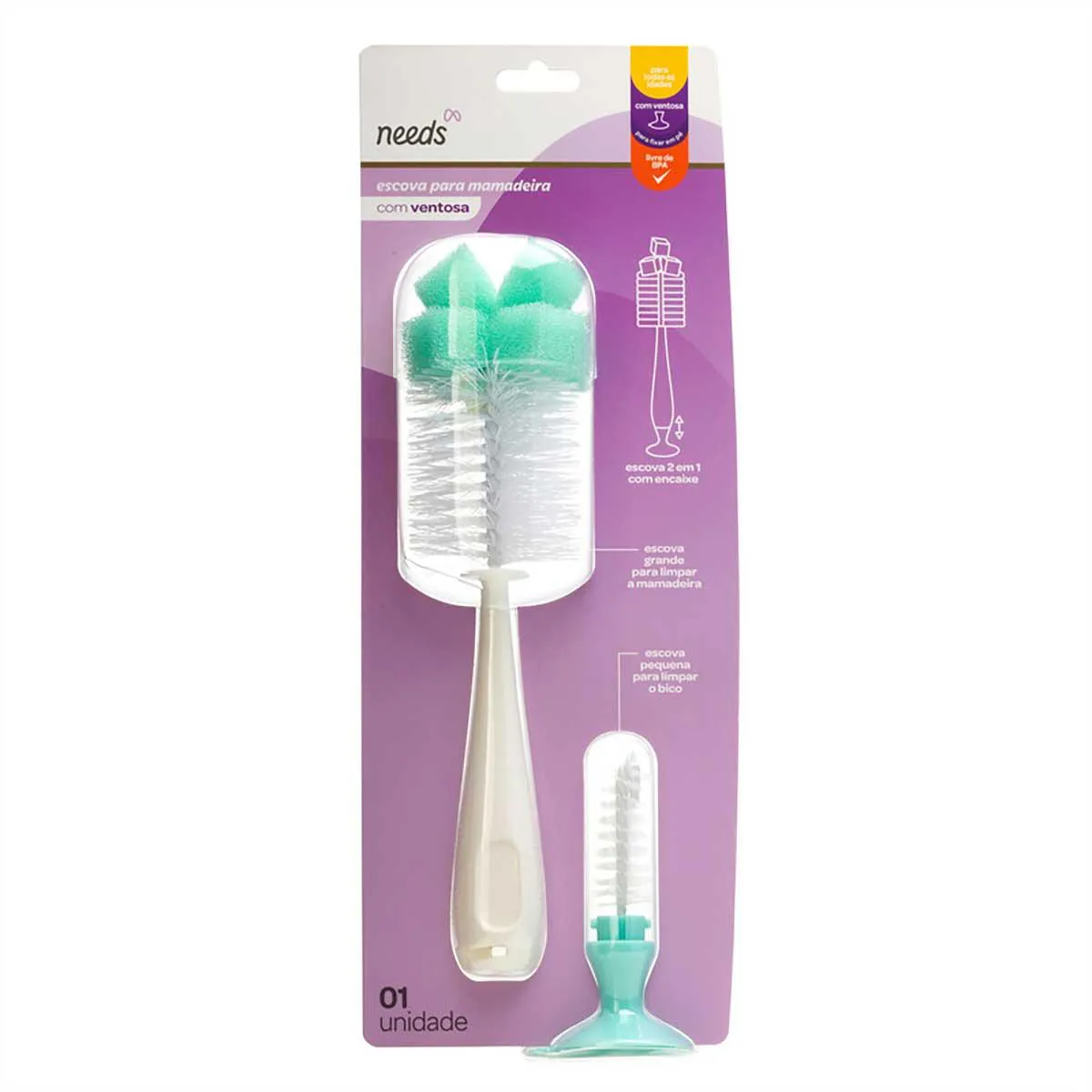 A Escova para Mamadeira Needs é indicada para auxiliar na Higienização das mamadeiras e bicos. Foi desenvolvida com cerdas e uma esponja que alcançam até as regiões mais difíceis de limpar, removendo os resíduos e evitando a contaminação por bactérias. Além disso, sua Base contém uma ventosa para manter a escova em pé.