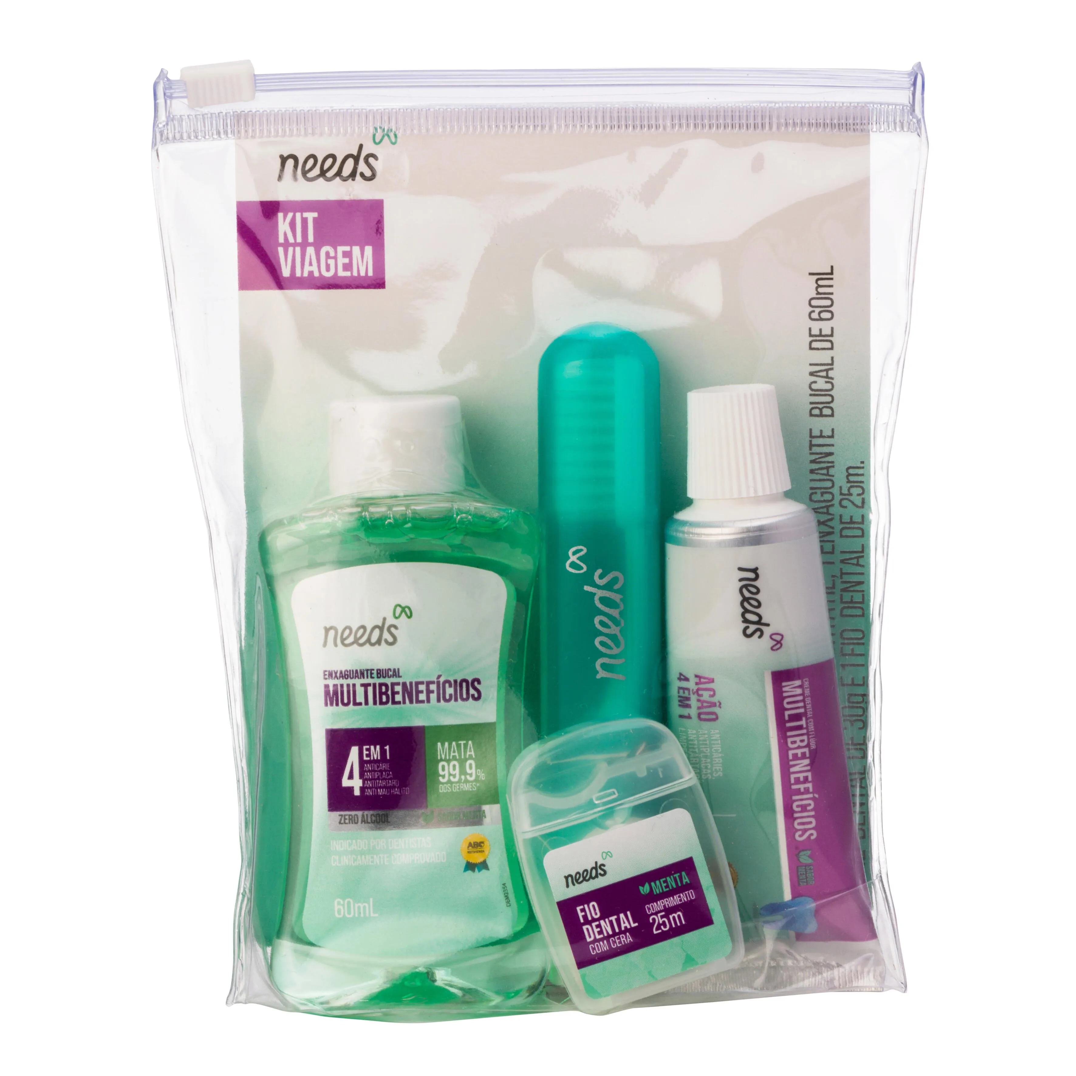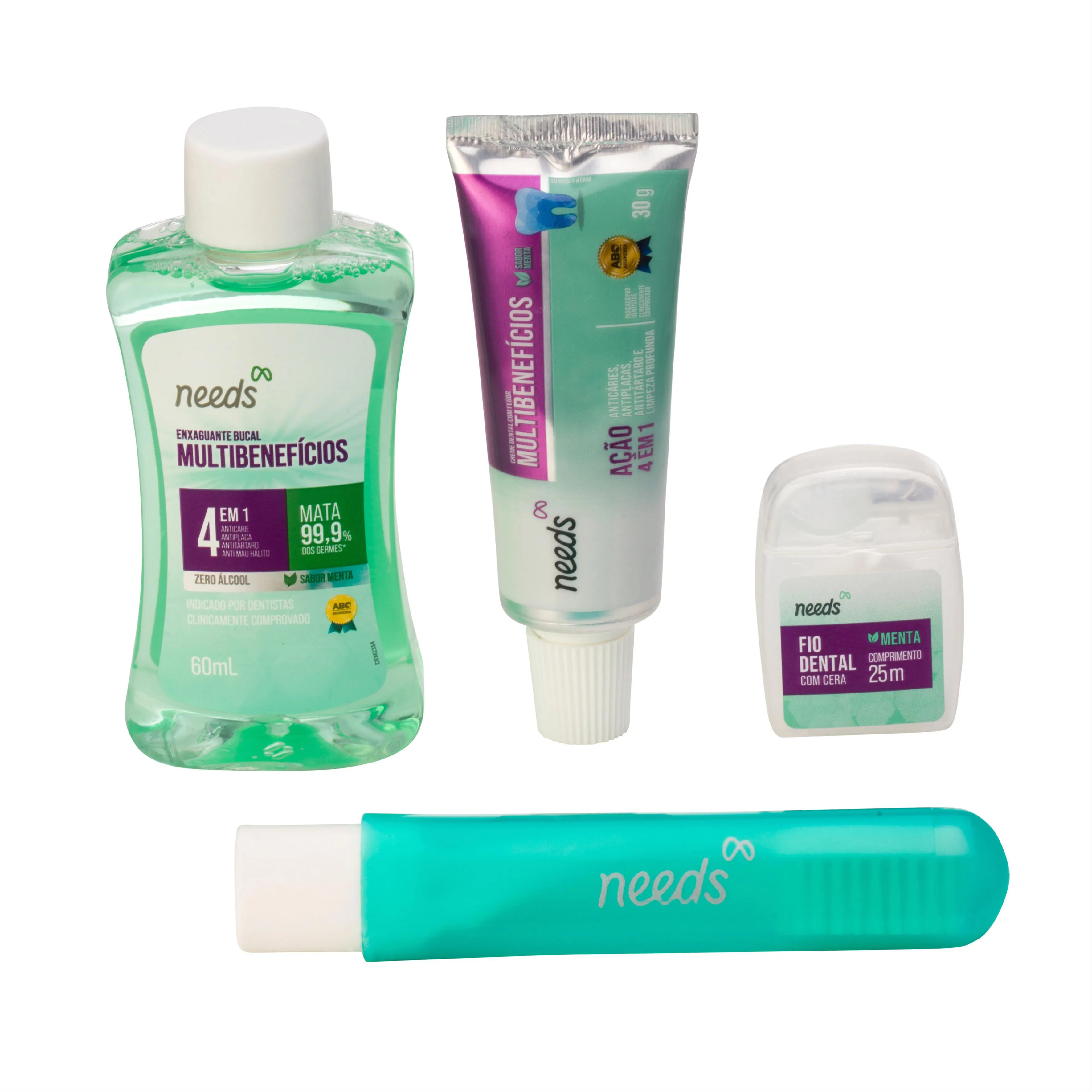 Kit Viagem Needs Oral Care Escova de Dente + Fio Dental de 25m + Pasta de Dente 50g + Enxaguante Bucal 60ml