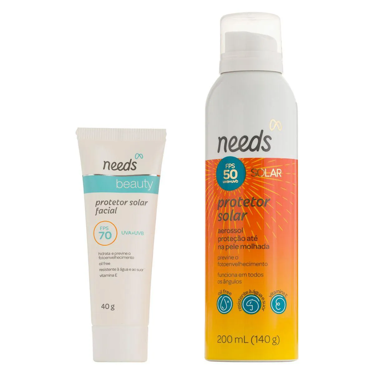 oferece proteção completa para corpo e rosto. É composto por um protetor corporal FPS 50 Needs Solar aerossol para maior praticidade na aplicação e um protetor facial Needs Beauty FPS 70 para um cuidado completo.