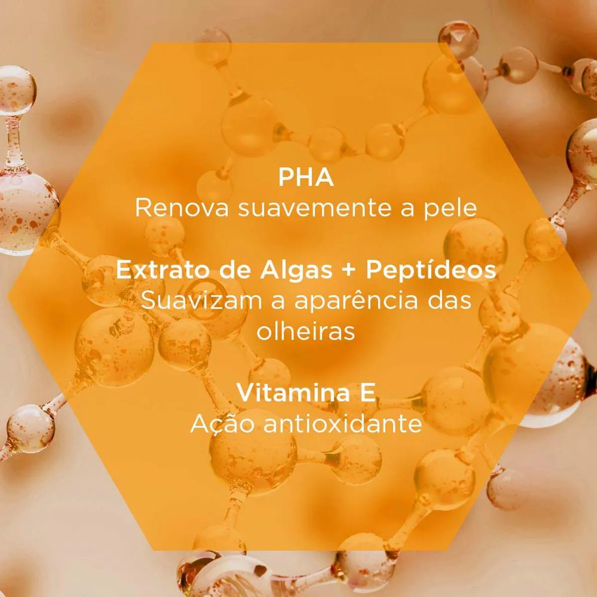 - Combina antioxidantes, peptídeos e extratos de algas para tratar olheiras.