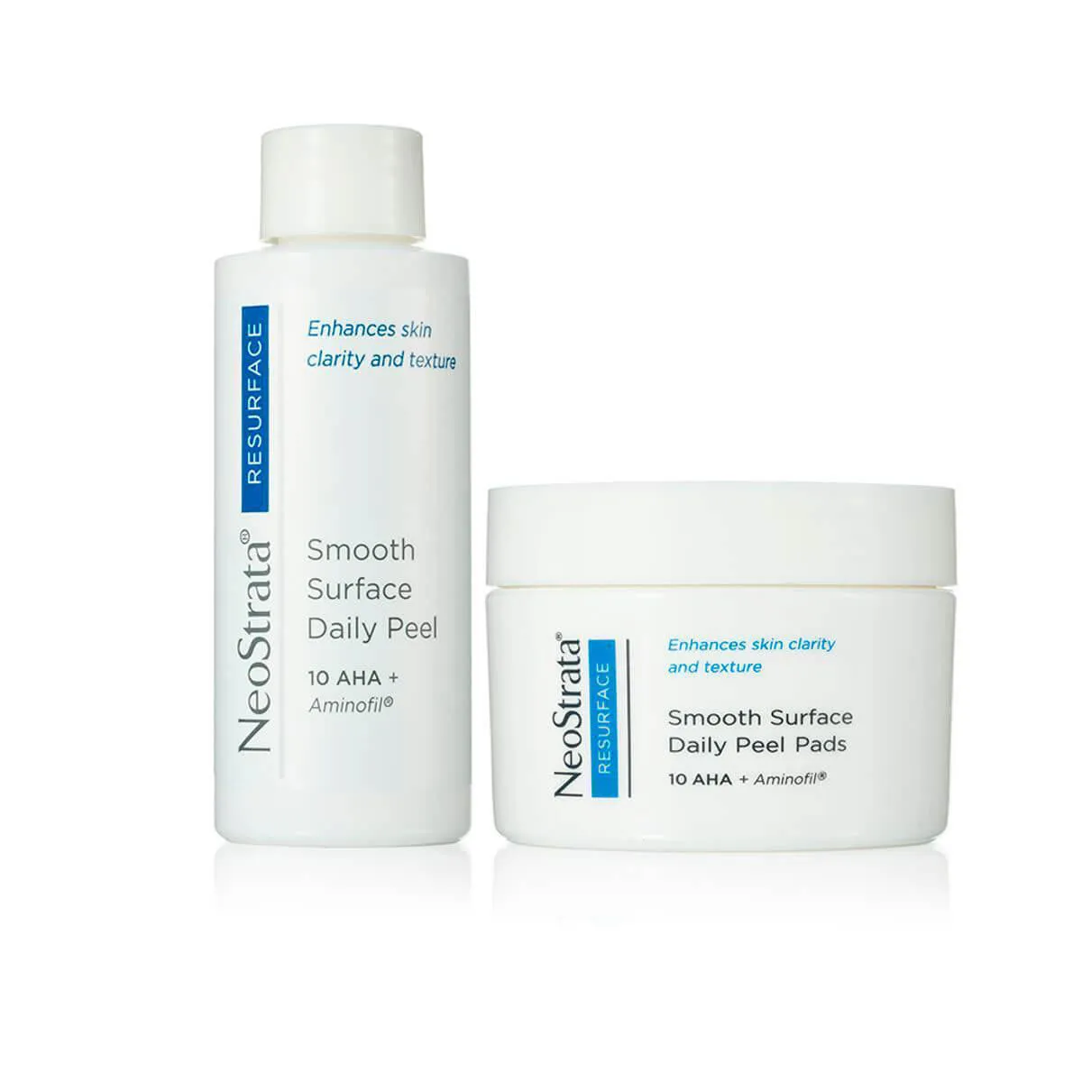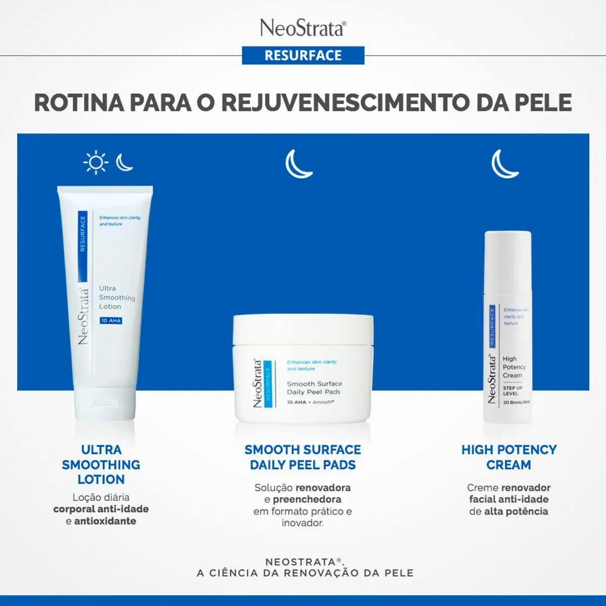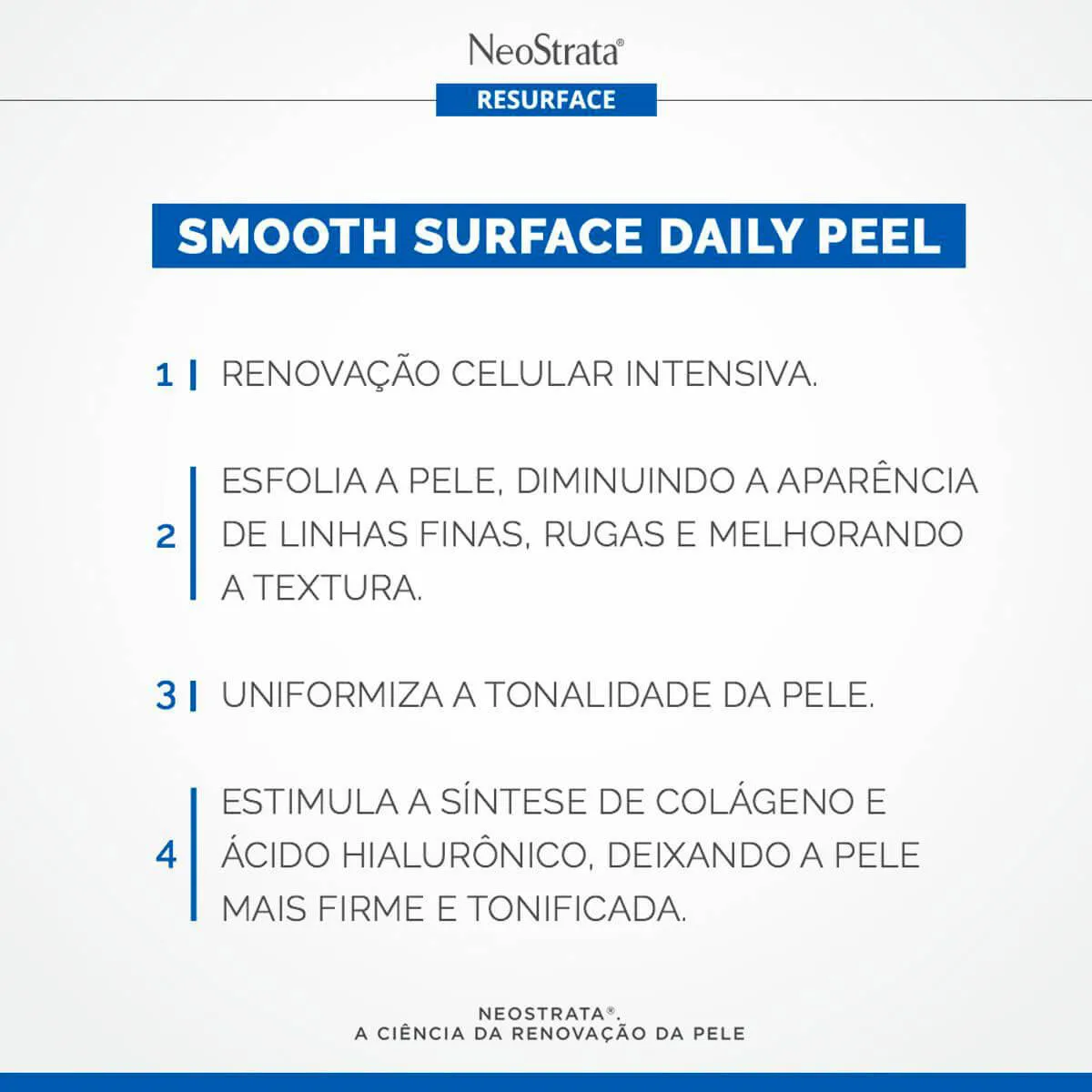 Para que serve: O Neostrata Resurface Smooth Surface Daily Peel Pads possui fórmula com solução anti-idade de 10% de Ácido Glicólico + Aminofil, em formato de discos, uma tecnologia exclusiva dentro de um formato diferenciado e prático, que promove a renovação celular e a melhora efetiva na redução de linhas finas, rugas, textura e tom da pele.