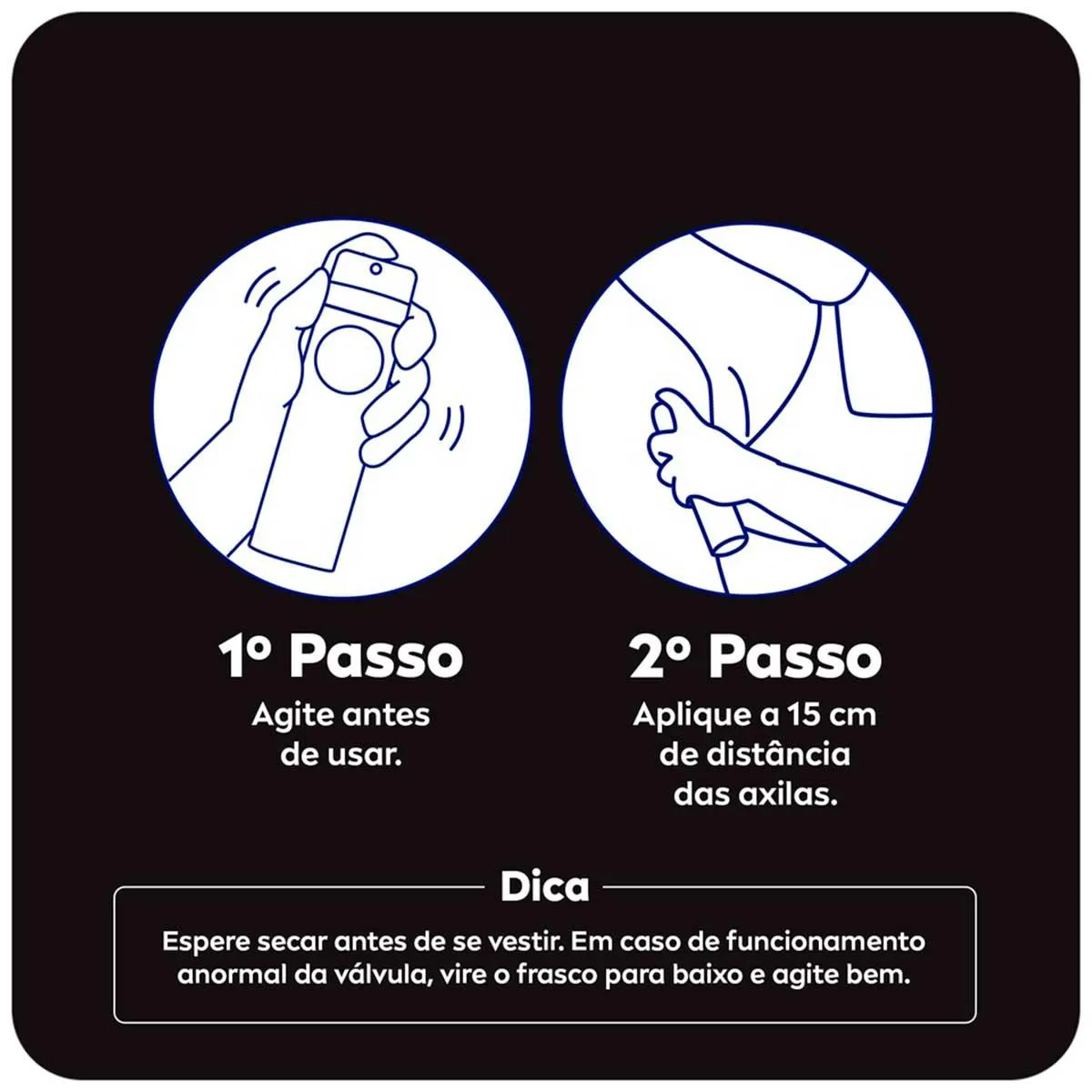 Agite bem antes de usar. Aplique somente nas axilas a não menos de 15 cm da Pele. Espere secar totalmente antes de vestir a roupa. Em caso de funcionamento anormal da válvula, vire o frasco para baixo e agite bem.