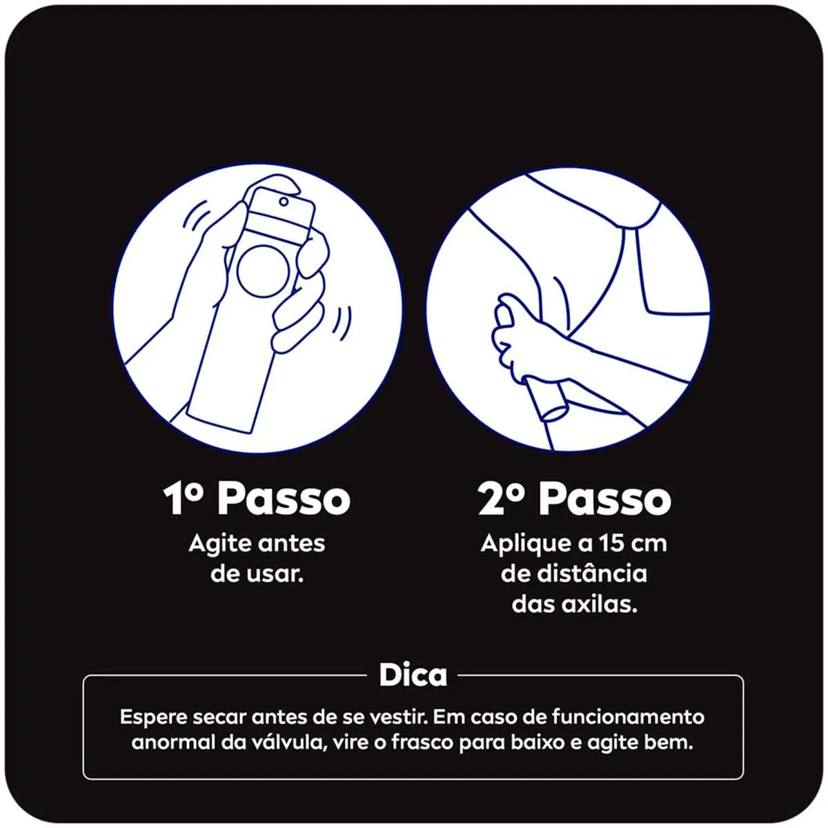 Agite bem antes de usar. Aplique somente nas axilas a não menos de 15 cm da Pele. Espere secar totalmente antes de vestir a roupa. Em caso de funcionamento anormal da válvula, vire o frasco para baixo e agite bem.