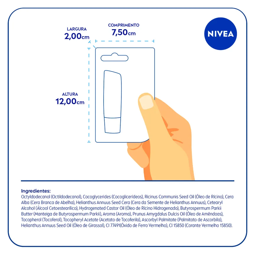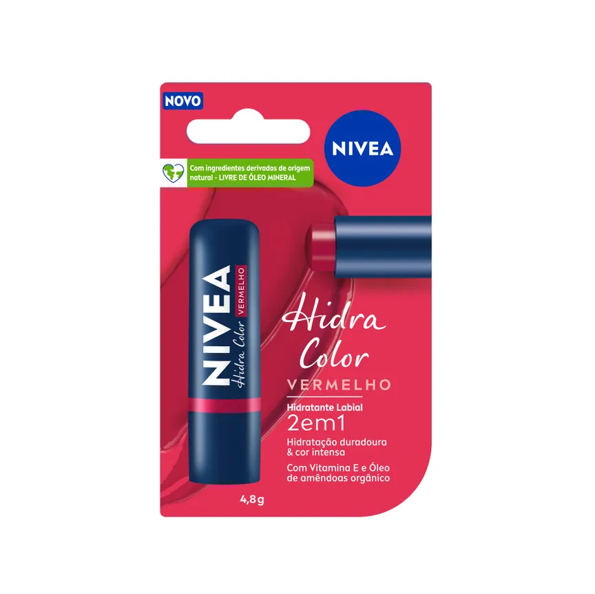 Especialmente desenvolvido para uso diário, Nivea Hidra Color é formulado com manteiga de karité, óleo de amêndoas orgânico e vitamina E, que vão deixar seus lábios bem cuidados. Seu acabamento é intenso e possui aroma floral suave. Não contém óleo mineral.
