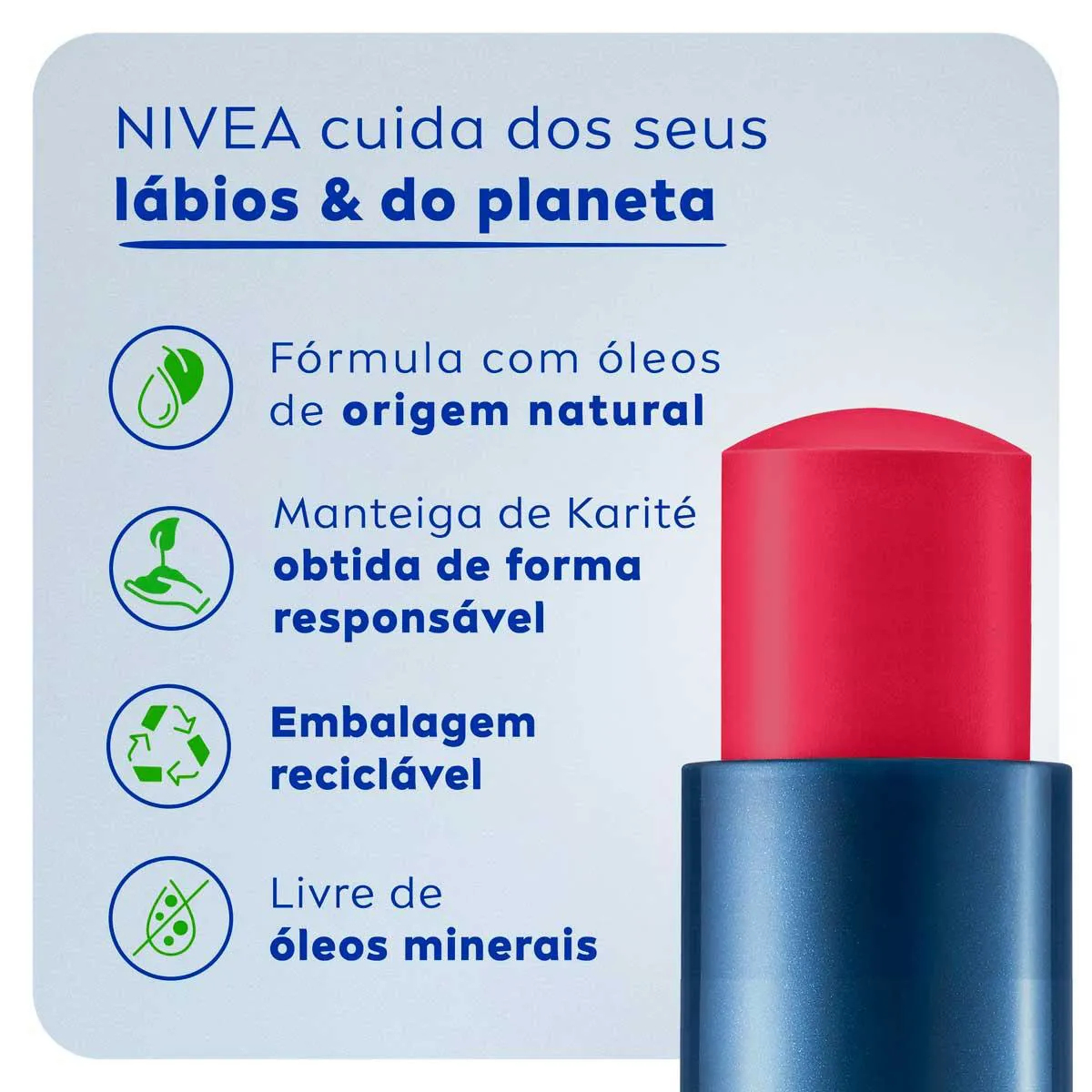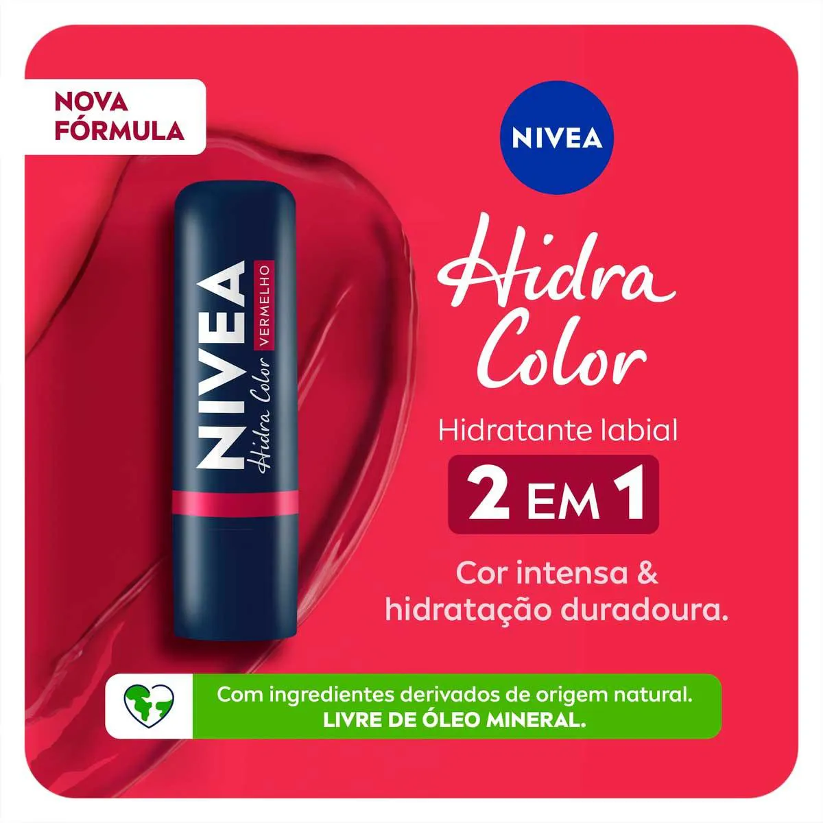 Nivea Hidra Color é um hidratante labial 2 em 1: hidrata e ainda dá cor aos seus Lábios. Ele protege os lábios contra o ressecamento, promove uma hidratação de longa duração e possui uma cremosidade que desliza de maneira fácil e uniforme.