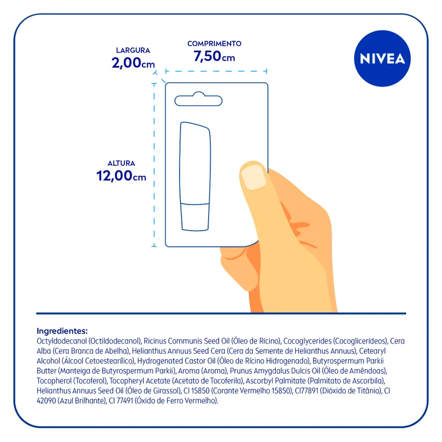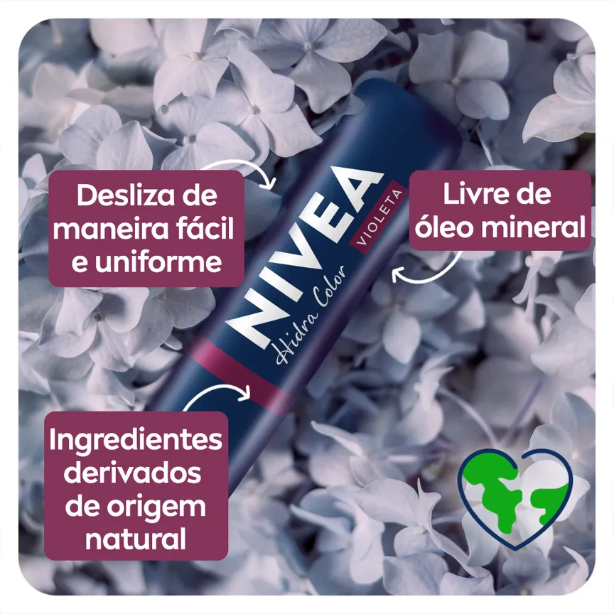 Especialmente desenvolvido para uso diário, Nivea Hidra Color é formulado com manteiga de karité, óleo de amêndoas orgânico e vitamina E, que vão deixar seus lábios bem cuidados. Seu acabamento é intenso e possui aroma floral suave. Não contém óleo mineral.