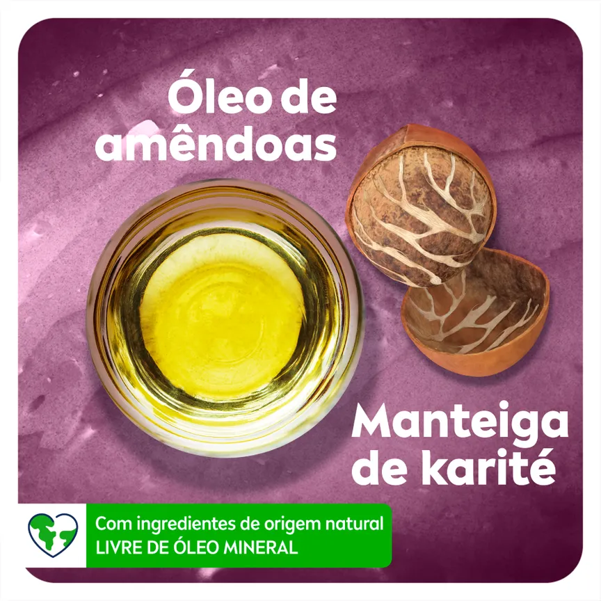 - Com manteiga de karité, óleo de amêndoas orgânico e vitamina E.