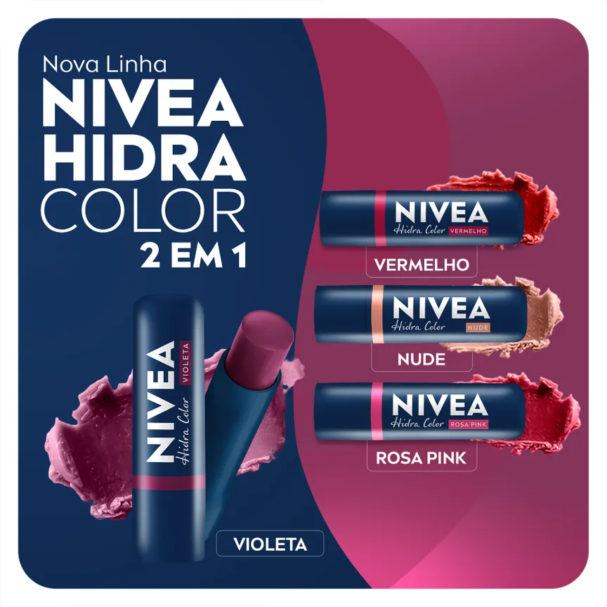Nivea Hidra Color é um hidratante labial 2 em 1: hidrata e ainda dá cor aos seus Lábios. Ele protege os lábios contra o ressecamento, promove uma hidratação de longa duração e possui uma cremosidade que desliza de maneira fácil e uniforme.