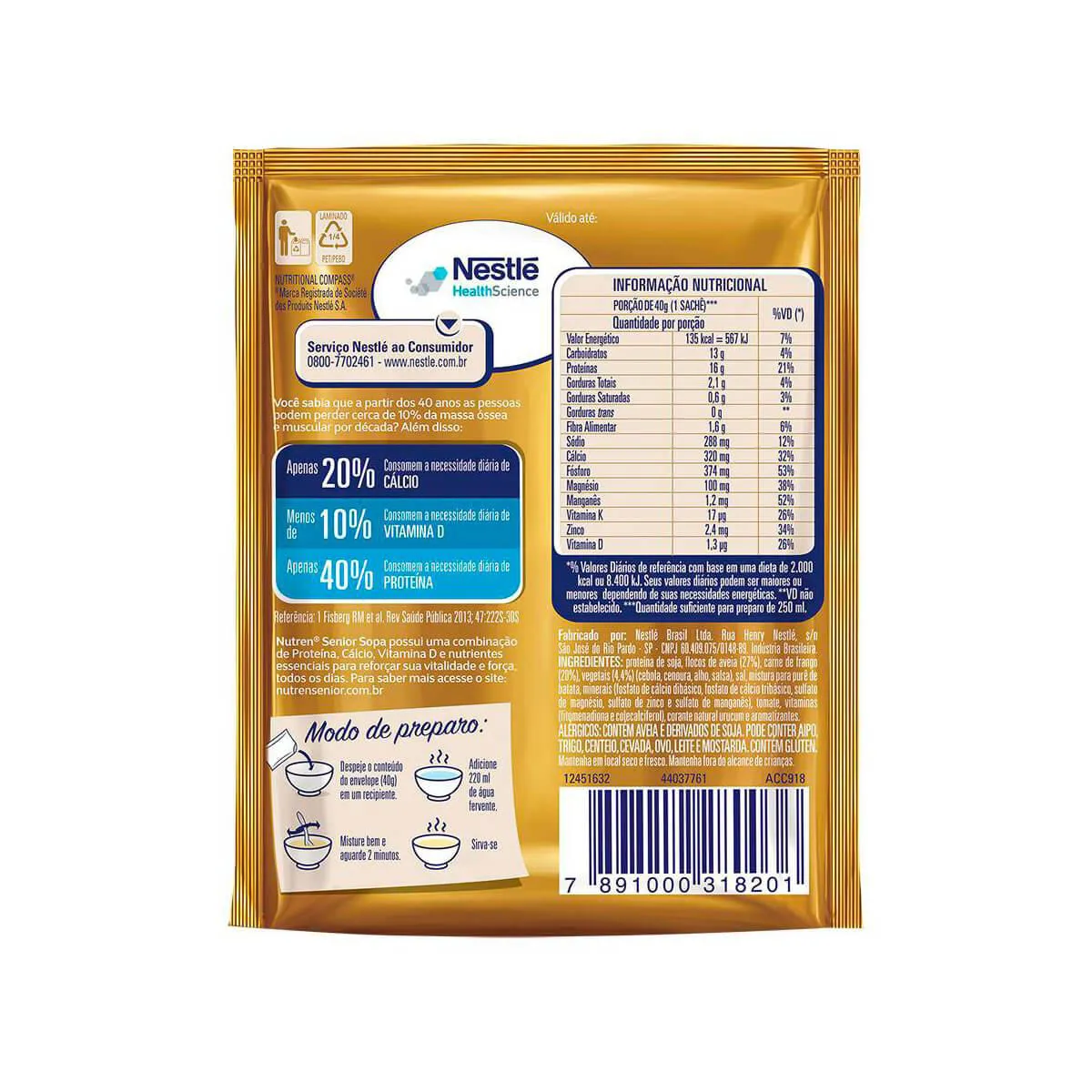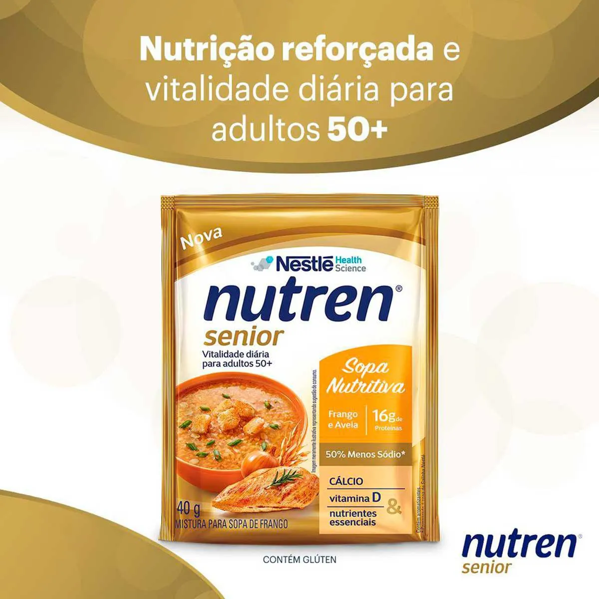 Nutren Senior é uma mistura de sopa para adultos a partir dos 50 anos de idade. Contém 16g de proteínas, cálcio, vitamina D, zinco e outros ingredientes essenciais para reforçar a nutrição. Tudo isso com 50% menos sódio, comparado à sopa de galinha Nestlé.