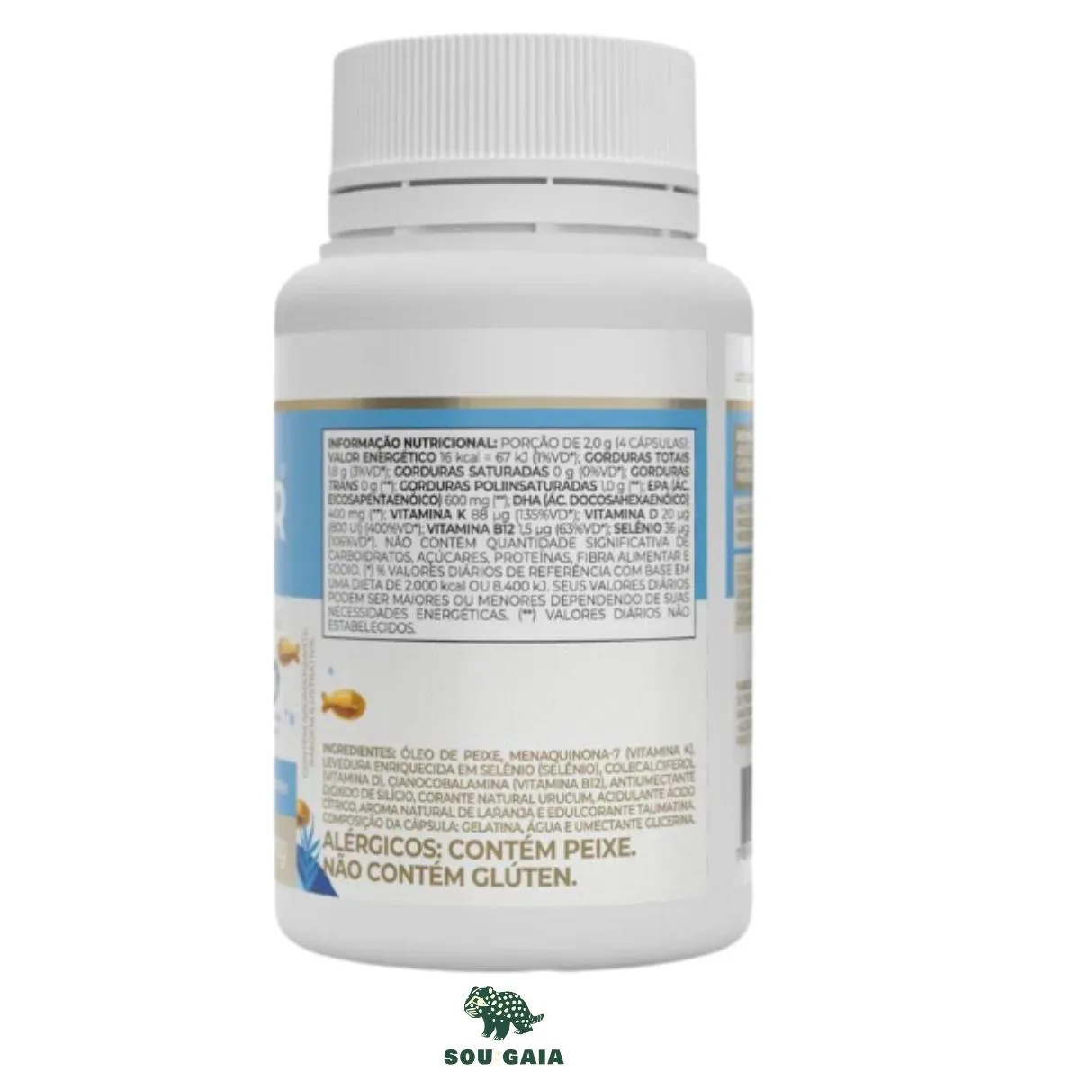 Óleo de peixe, menaquinona-7 (vitamina K), levedura enriquecida em selênio (selênio), colecalciferol (vitamina D), cianocobalamina (vitamina B12), antiumectante dióxido de silício, corante natural urucum, acidulante ácido cítrico, aroma natural de laranja e edulcorante taumatina. Composição da cápsula: gelatina, água e umectante glicerina.