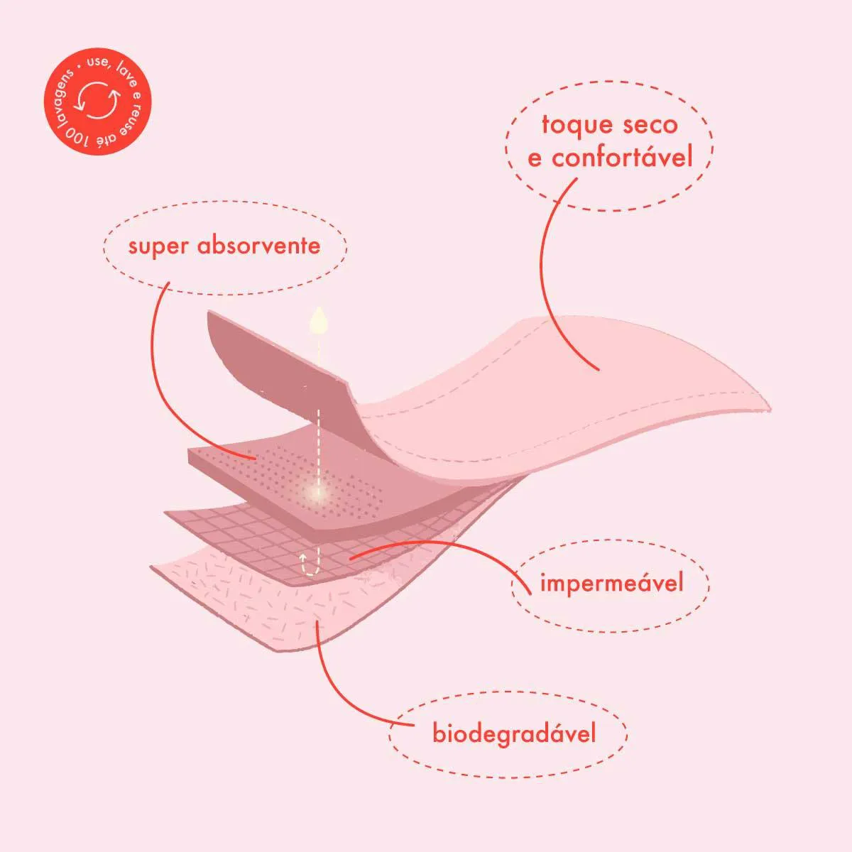 A Dry possui tecidos super absorventes, de secagem rápida, impermeáveis, respiráveis, anti-bactérias e anti-odores, que absorvem até 100ml de urina, substituindo completamente os absorventes descartáveis. Seu exterior é todinho feito em modal preto - tecido 100% natural, super macio ao toque, muito confortável e respirável como o algodão - mas muito mais sustentável porque usa menos água em sua produção - além disso, regula a temperatura e a umidade.