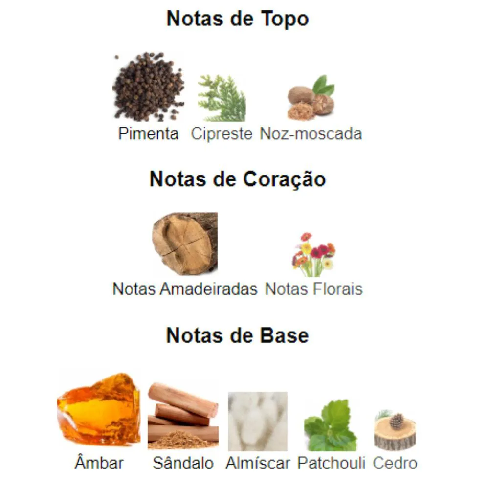 Notas de Base: Âmbar, Sândalo, Almíscar, Patchouli e Cedro