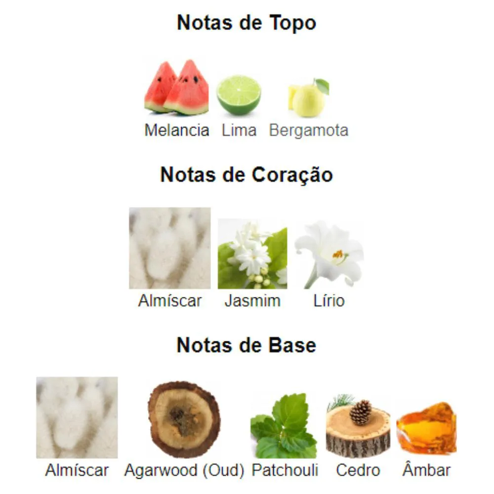 Notas de Base: Almíscar, Agarwood (Oud), Patchouli, Cedro e Âmbar