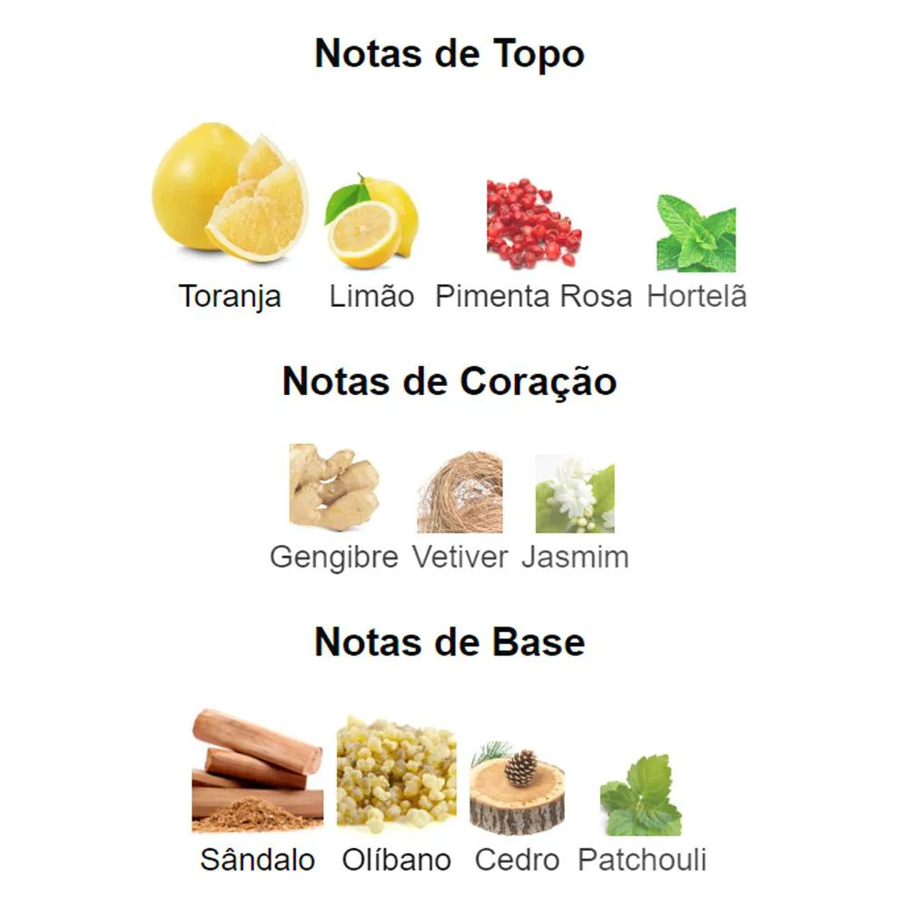 Notas de Coração: Gengibre, Vetiver e Jasmim.