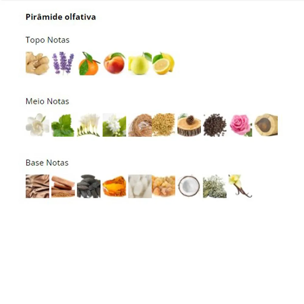 Notas de Fundo: Baunilha, Fava Tonka, Coco, Sândalo, Âmbar, Benjoim, Couro, Almíscar e Musgo de Carvalho