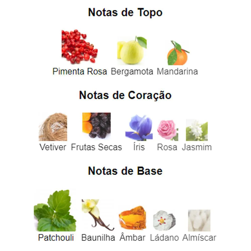 Coração: Vetiver, Frutas Secas, Íris, Rosa e Jasmim.