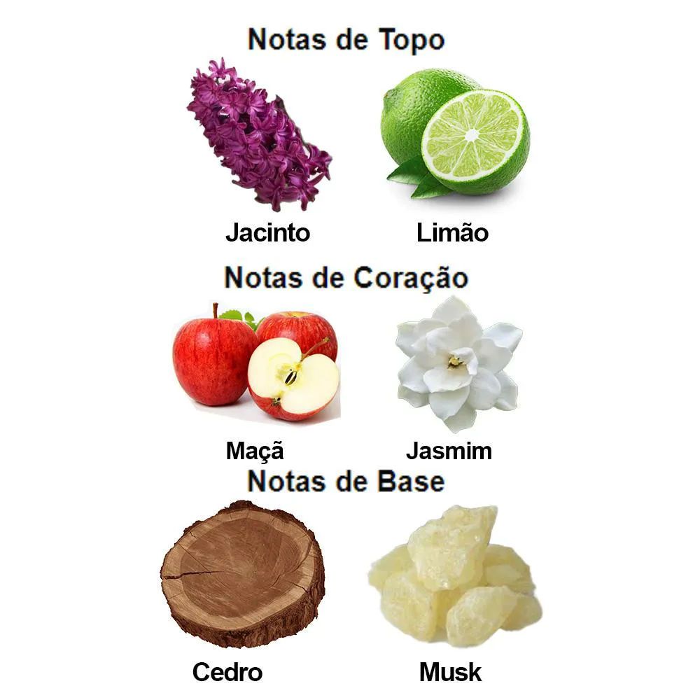 Notas de Topo: Limão siciliano, maçã, cedro e câmpula