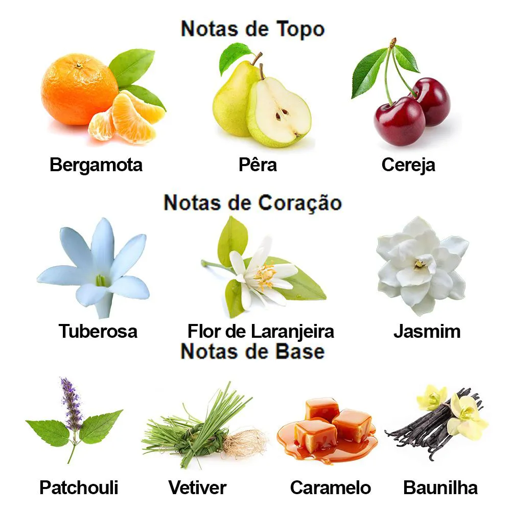 Pertencente à família olfativa floral oriental, a fragrância abre com notas de bergamota, pera e cereja no topo; seu coração é composto por tuberosa, flor de laranjeira e jasmim árabe; e termina com notas de patchouli, vetiver, caramelo e baunilha no fundo. Essa combinação cria uma fragrância cativante e memorável.