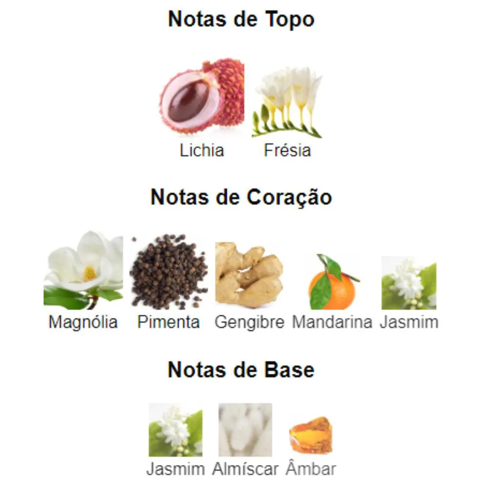 Além de sua essência encantadora, o perfume é apresentado em um frasco elegante e sofisticado. A transparência do vidro revela a cor dourada do líquido, evocando uma sensação de luxo e feminilidade. A tampa prateada complementa o design minimalista e moderno, tornando-o uma adição deslumbrante à sua coleção de perfumes.