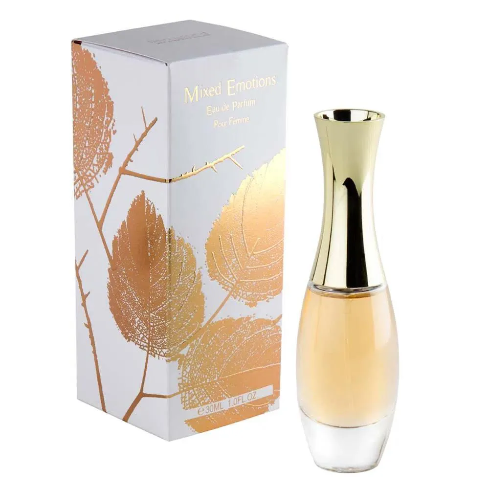 O frasco do Perfume Mixed Emotions reflete a dualidade temática da fragrância. Com linhas elegantes e um design contemporâneo, o frasco captura a interplay entre a força e a delicadeza, com detalhes sutis que representam a variedade de emoções que cada mulher experimenta.
