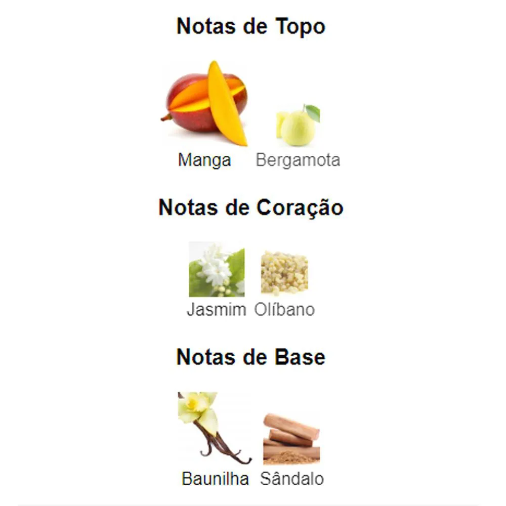 A fragrância é um mix de jasmim puro, manga com um toque, de incenso cremoso.