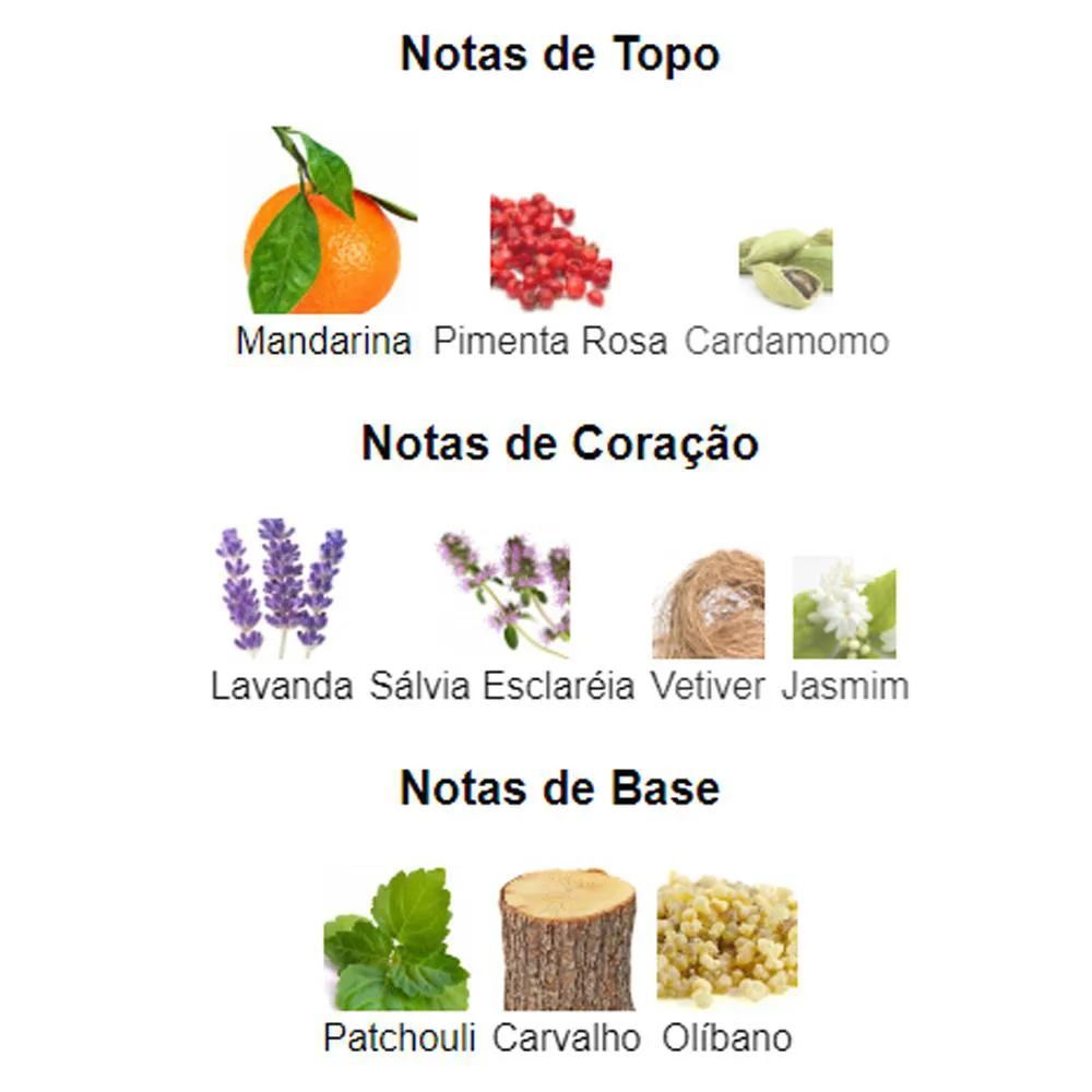 Fundo: Madeira de carvalho reciclada, óleo de olíbano, coração de patchouli.