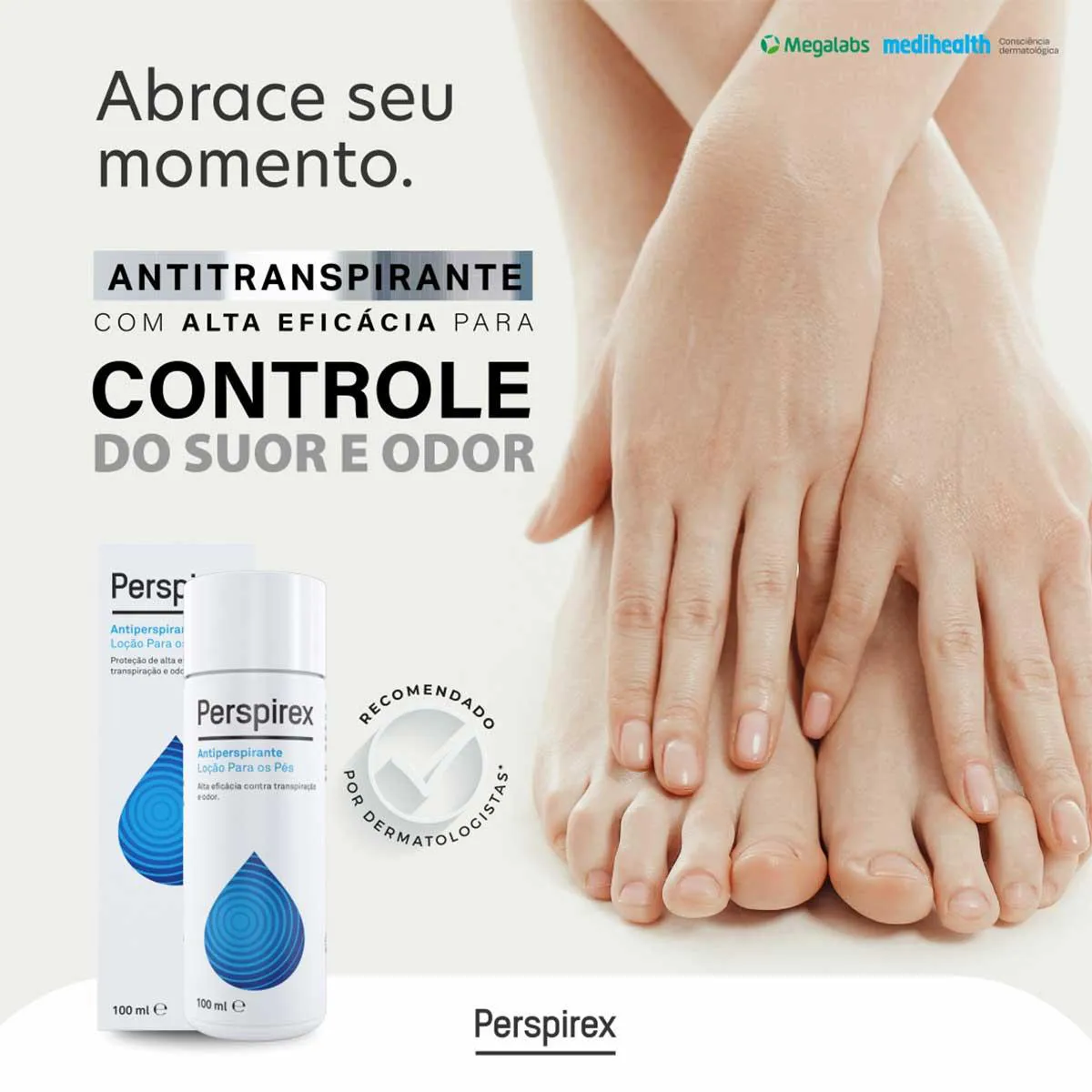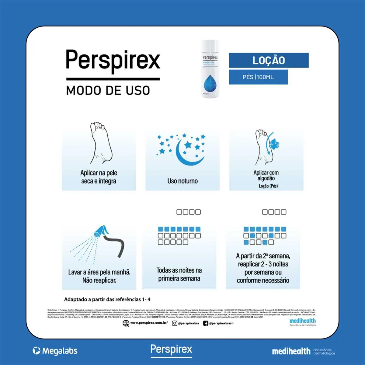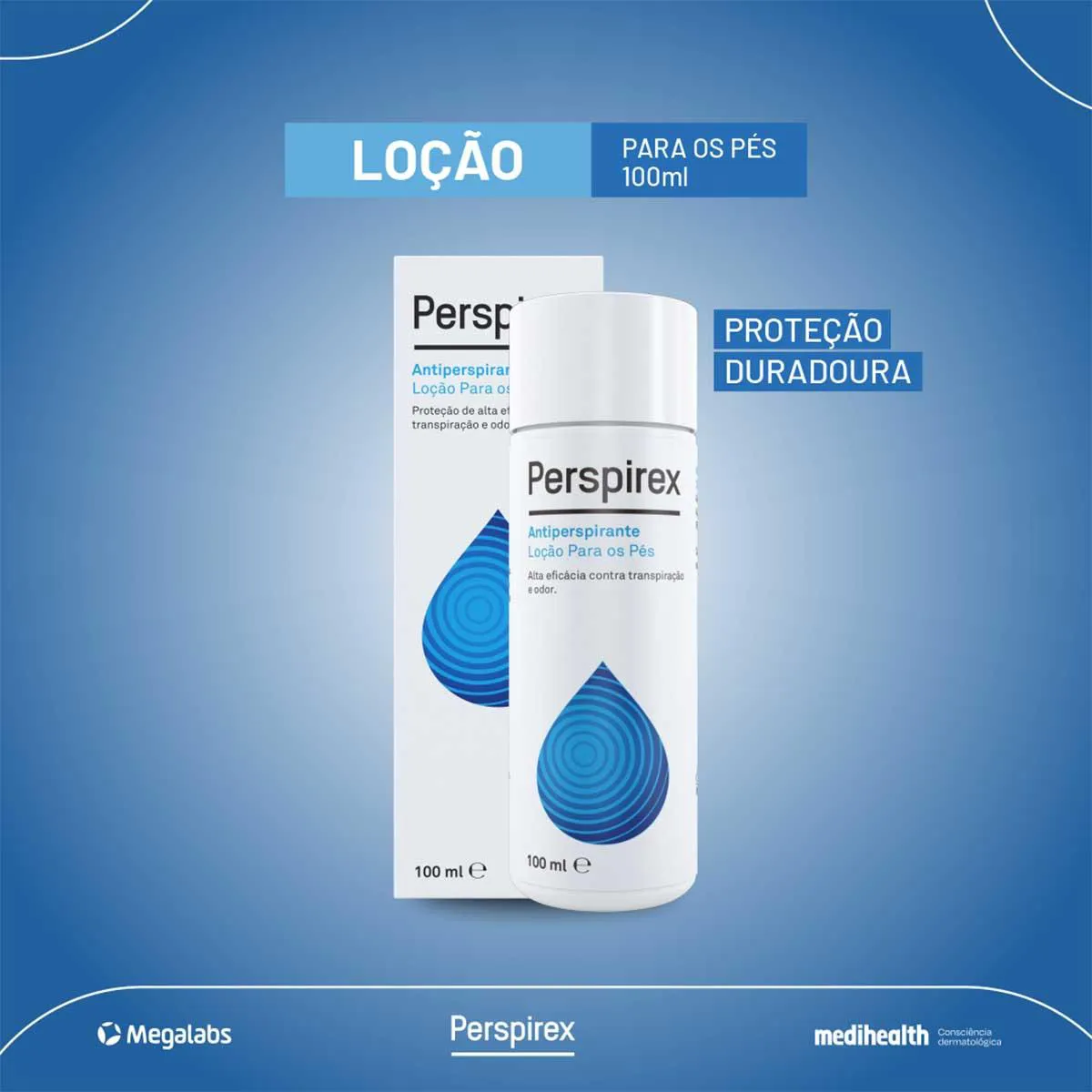 Com fórmula composta por 25% de Cloreto de Alumínio, ativo que oferece um Tratamento eficaz contra a transpiração e o odor, o uso da loção Perspirex inibe o desconforto dos pés causado pela umidade, controlando o suor da região, prevenindo a formação de bactérias e, consequentemente, eliminando o mau odor.