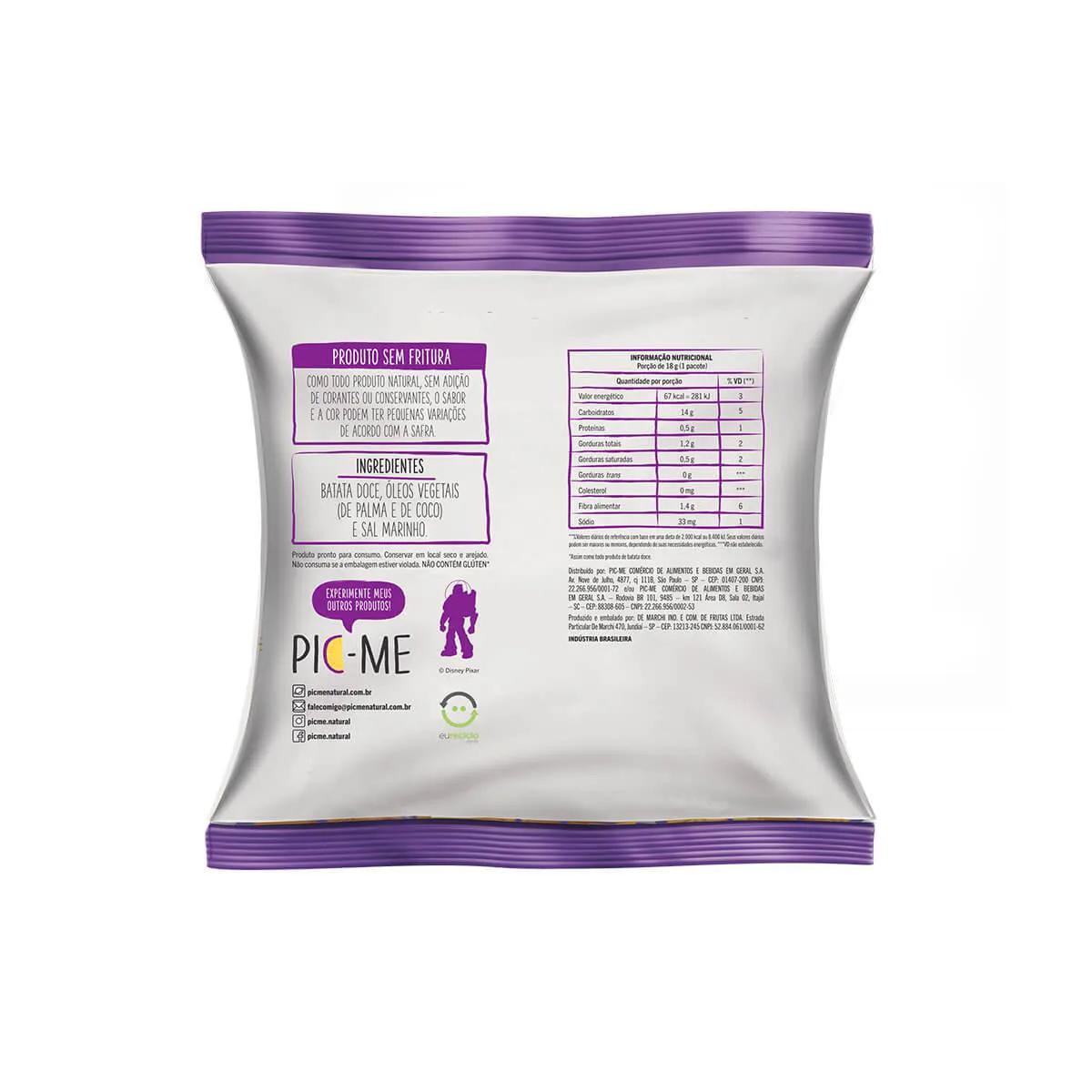 O Pic-Me Chips Batata Doce é um snack feito com óleos vegetais (de palma e de coco) e sal marinho, além de outros ingredientes naturais.