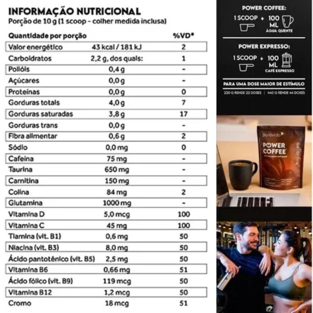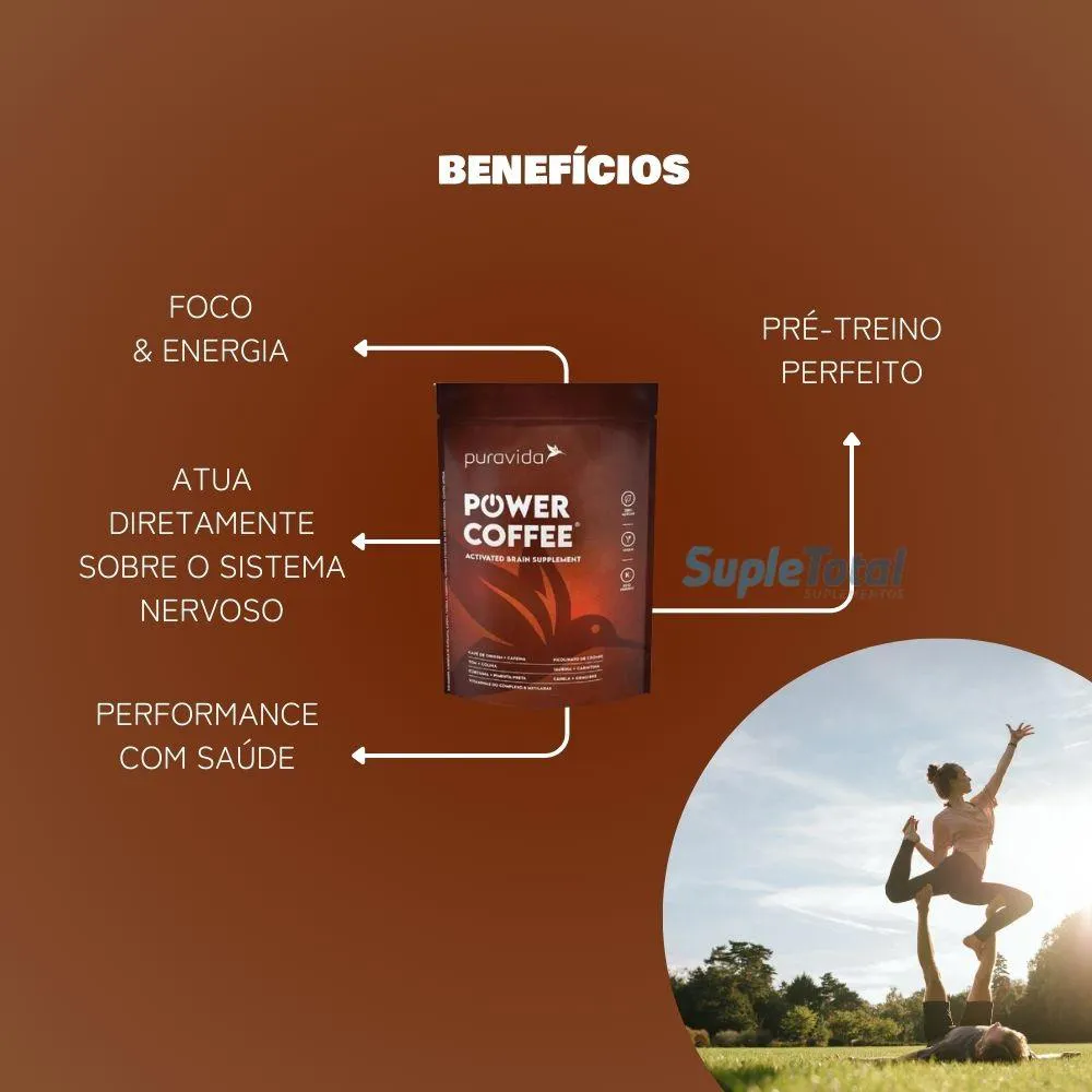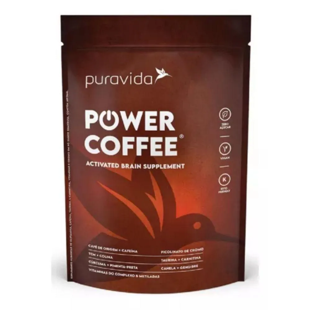 Power Coffee é uma deliciosa bebida à Base de café de origem, com um blend de aromas de especiarias diversas e avelãs tostadas.Mas é também um suplemento elaborado com 24 ingredientes benéficos, entregues em uma base de TCM, nutriente de energia cetogênica do óleo do coco.Seguindo o padrão Puravida de qualidade máxima, escolhemos a melhor e mais biodisponível versão de cada um dos ativos e nutrientes, que atuam em perfeita sinergia para oferecer um shot de benefícios importantes.Power Coffee é um nootrópico com atuação direta na otimização da atenção, do foco e da produtividade no trabalho, nos estudos ou em qualquer atividade que demande de sua performance mental.Power Coffee é também um ativador metabólico, com nutrientes importantes para a harmonia metabólica. É o caso da Colina, essencial para o metabolismo das gorduras, do Picolinato de Cromo, da L-Carnitina e dos aminoácidos Glutamina e Taurina, além da versão biodisponível de vitaminas do complexo B (metiladas), vitamina D3 e vitamina c.