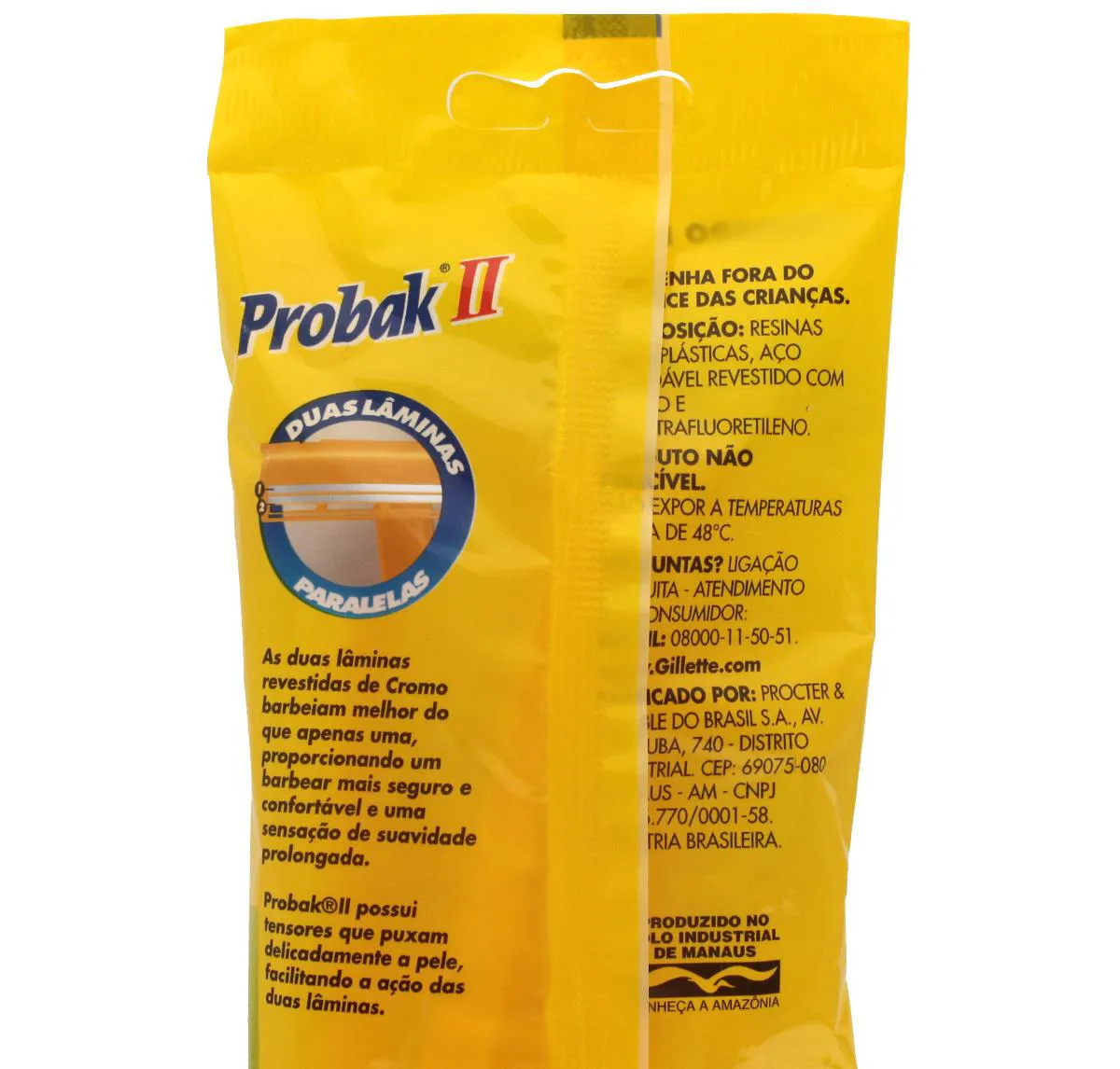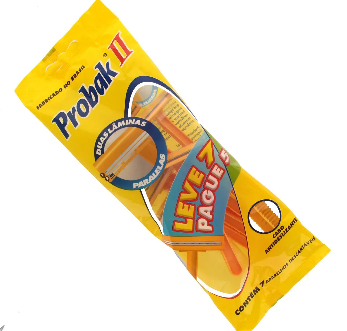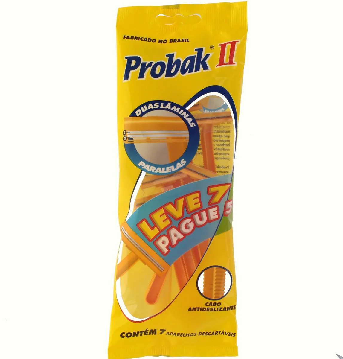 Probak II é um aparelho para barbear descartável com duas lâminas de alta qualidade e cabo antideslizante que garantem um barbear mais seguro e suave. Ele está disponível em embalagem econômica com 7 unidades.