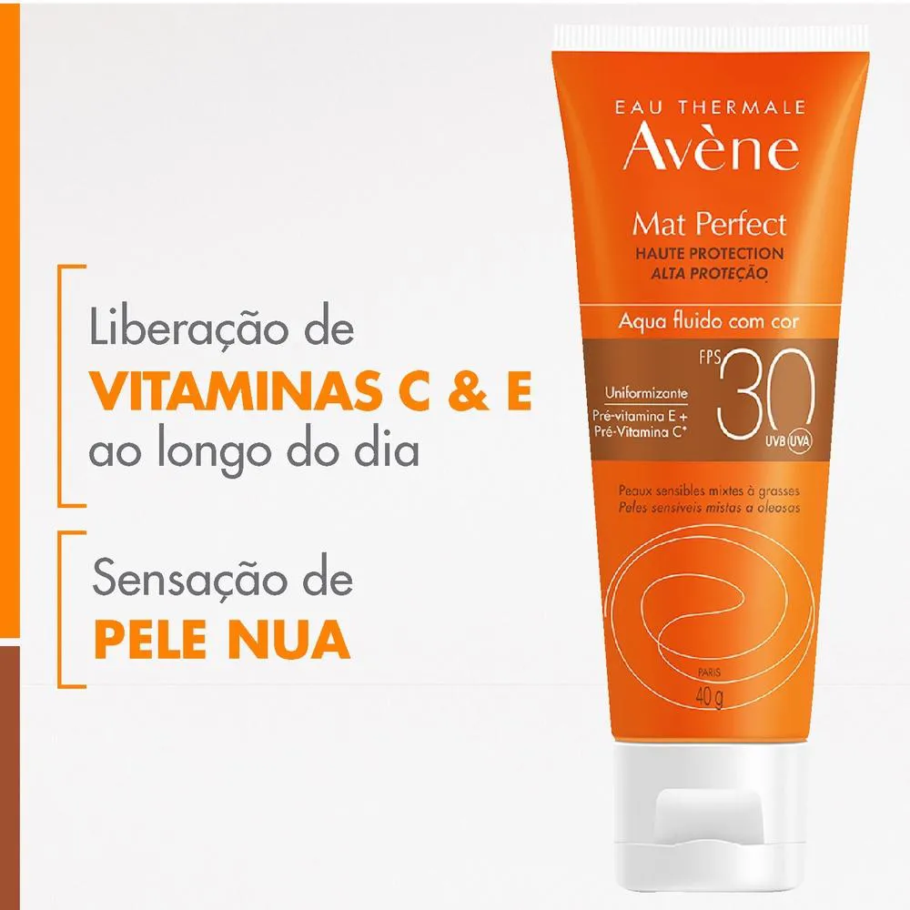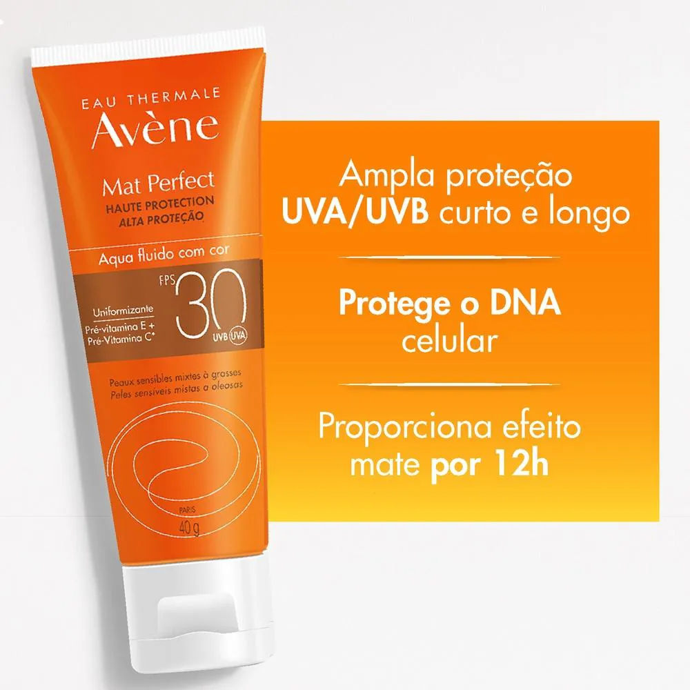 Mat Perfect Avène Aqua-Fluido é um protetor solar facial com cor que protege a Pele contra os danos causados pelo sol, controla a produção de óleo do rosto e previne envelhecimento precoce.