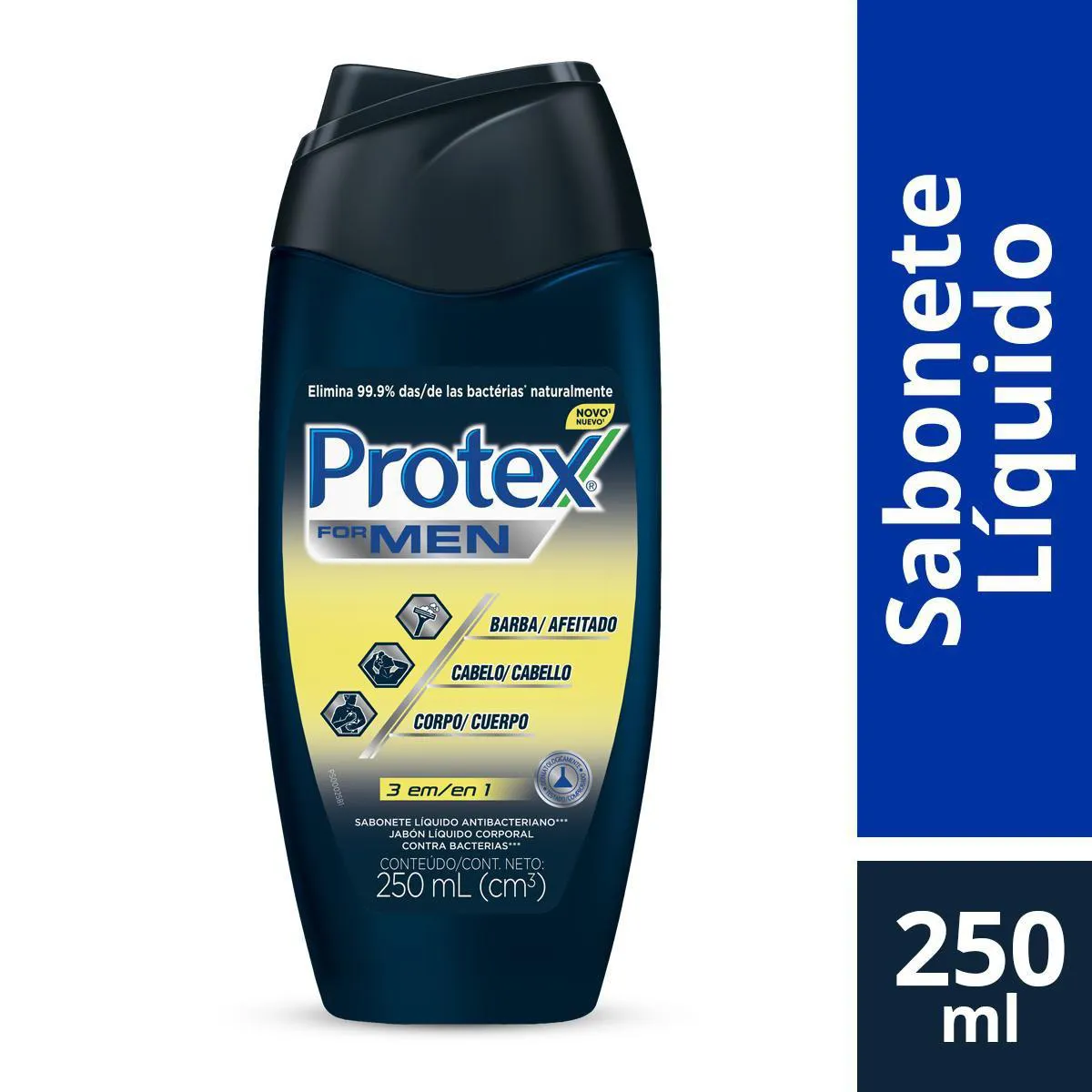 O Sabonete Líquido Corporal Protex Men 3 em 1 possui fórmula que oferece toda a praticidade que o homem procura com benefícios para o Corpo: limpa ativamente sem ressecar a Pele. cabelo: deixa o seu cabelo limpo e com perfume masculino. Barba: prepara a pele para um barbear suave.