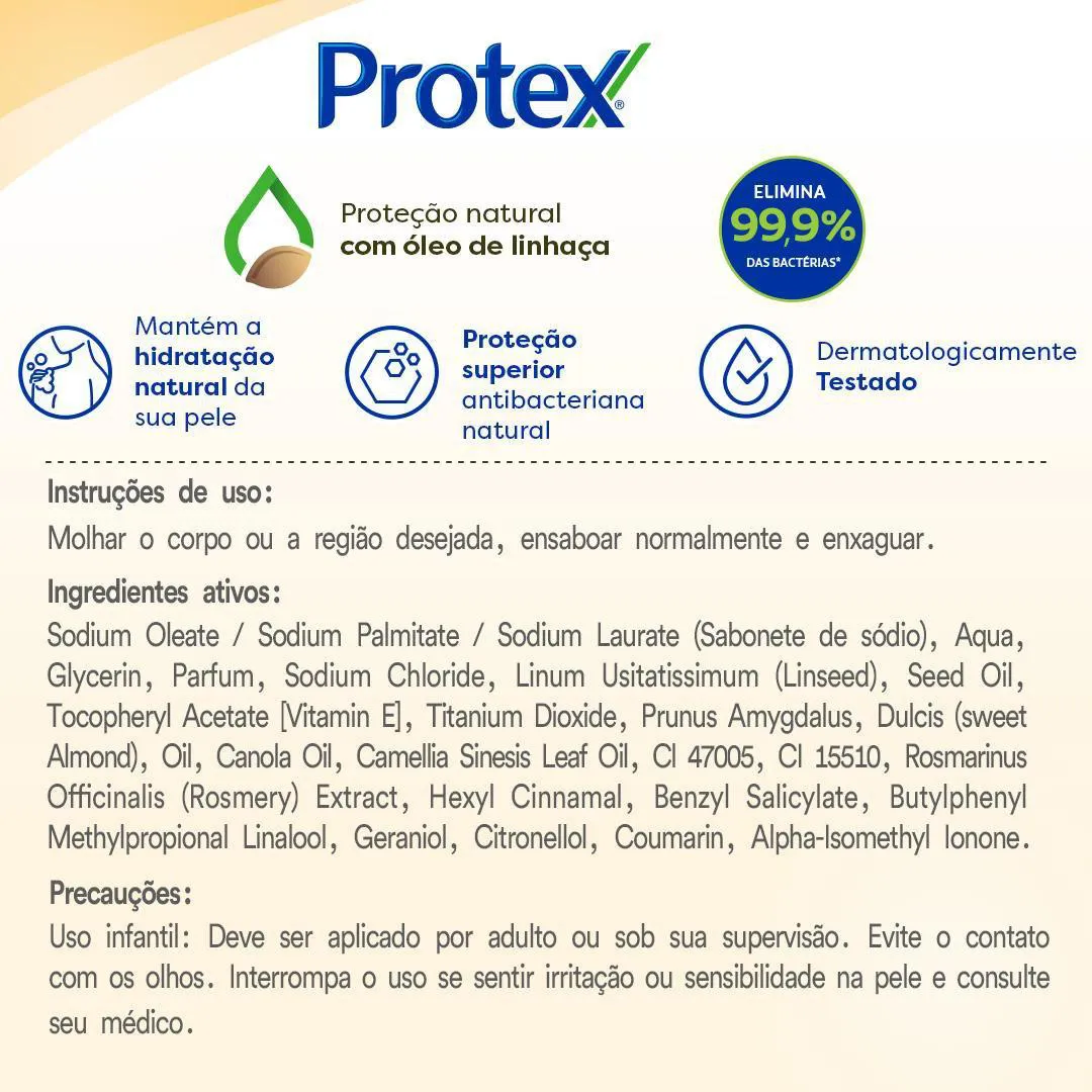 Indicado para a Higienização das mãos ou como sabonete líquido para Banho, Protex Vitamina E cria uma camada protetora que auxilia na prevenção da proliferação de bactérias na pele e elimina até 99,9% delas. Pode ser utilizado em todos os tipos de pele.
