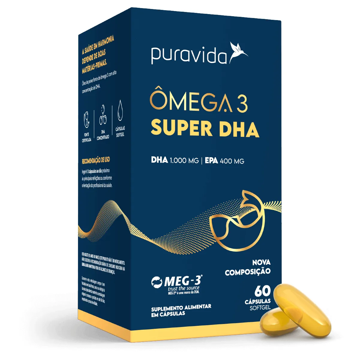 Ômega 3 DHA 1000mg Puravida é um suplemento alimentar de óleo de peixe com DHA concentrado em cápsulas, componente estrutural e funcional das células, do cérebro, do sistema nervoso e dos Olhos. Este suplemento está disponível em embalagem com 60 cápsulas de 100mg cada.