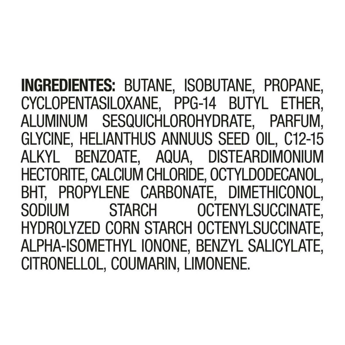 Butane, Isobutane, Propane, Cyclomethicone, Aluminium Sesquichlorohydrate, Calcium Chloride, Glycine, Aqua, PPG-14 Butyl Ether, Parfum, Disteardimonium Hectorite, BHT, Propylene Carbonate, Dimethiconol, Sodium Starch Octenylsuccinate, Hydrolyzed Corn Starch Octenylsuccinate, Gelatin Crosspolymer, Alpha-Isomethil Ionone, Benzyl Salicylate, Citronellol, Coumarin, Hexyl Cinnamal, Limonene, Linalool.