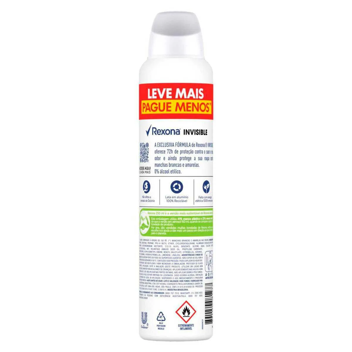 A nova e exclusiva fórmula de Rexona Invisible trabalha com um sistema de partículas menores e mais estáveis que formam uma barreira protetora mais resistente e duradoura contra a transpiração e o mau odor, mantendo você seco, fresco e protegido a cada novo movimento e por muito mais tempo. Sua tecnologia protege a sua roupa contra manchas brancas e amarelas. 0% álcool*. (*) Não contém álcool etílico.