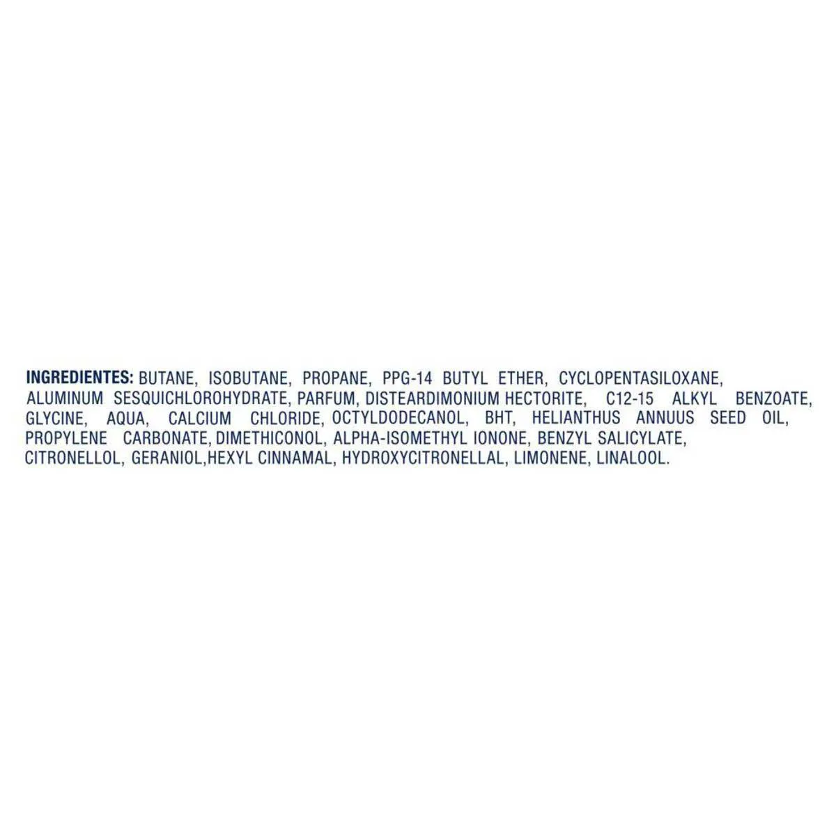 Butane, Isobutane, Propane, Cyclomethicone, Ppg-14 Butyl Ether, Aluminum Sesquichlorohydrate, Parfum, Disteardimonium Hectorite, Glycine, Aqua, Calcium Chloride, Propylene Carbonate, Bht, Alpha-Isomethyl Ionone, Benzyl Salicylate, Citronellol, Geraniol, Hexyl Cinnamal, Hydroxycitronellal, Limonene, Linalool.