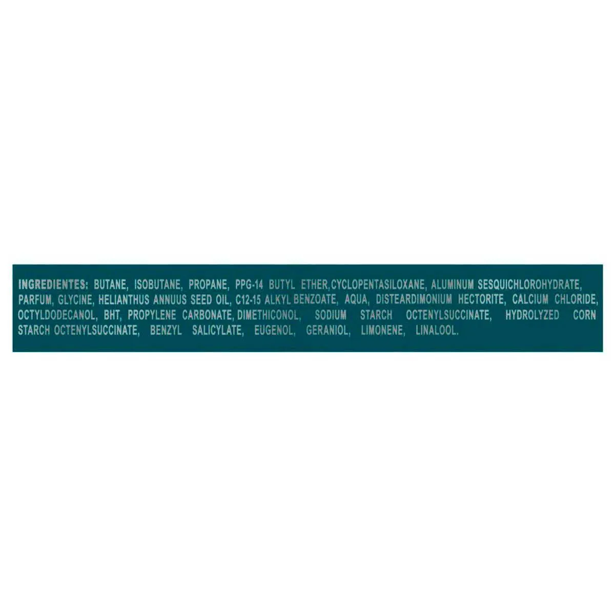 Butane/isobutane/propane, Aluminum Chlorohydrate, Ppg-14 Butyl Ether, Cyclomethicone, Parfum, Disteardimonium Hectorite, Caprylic/capric Triglyceride, Hydrated Silica, Gelatin Crosspolymer, Aqua, Cellulose Gum, Sodium Benzoate, Sodium Starch Octenylsuccinate, Maltodextrin, Hydrolyzed Corn Starch, Silica, Lpha-isomethyl Ionone, Benzyl Salicylate, Butylphenyl Methylpropional, Cinnamyl Alcohol, Citronellol, Coumarin, Geraniol, Hexyl Cinnamal, Limonene, Linalool.
