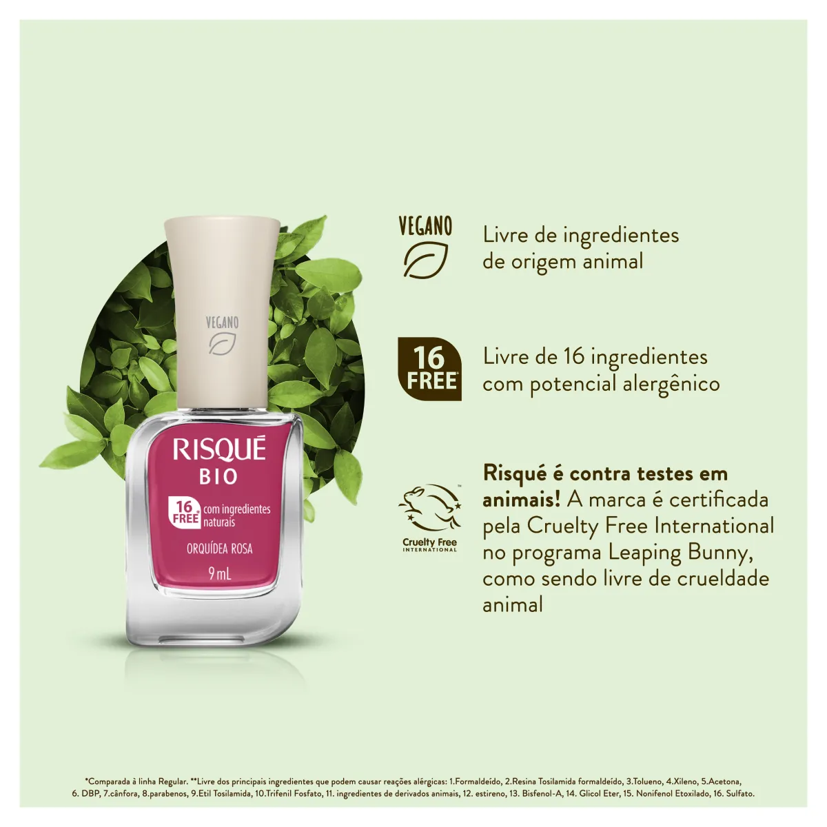 A nova linha de esmaltes Risqué BIO é cruelty-free e vegana, possui fórmula hipoalergênica e 16-free. Com ingredientes e pigmentos naturais, ela traz uma fórmula enriquecida com o superfood couve kale e óleo de melaleuca. Além disso, conta com frasco único, tampa feita de plástico reciclado e pincel com 880 cerdas de origem vegetal.
