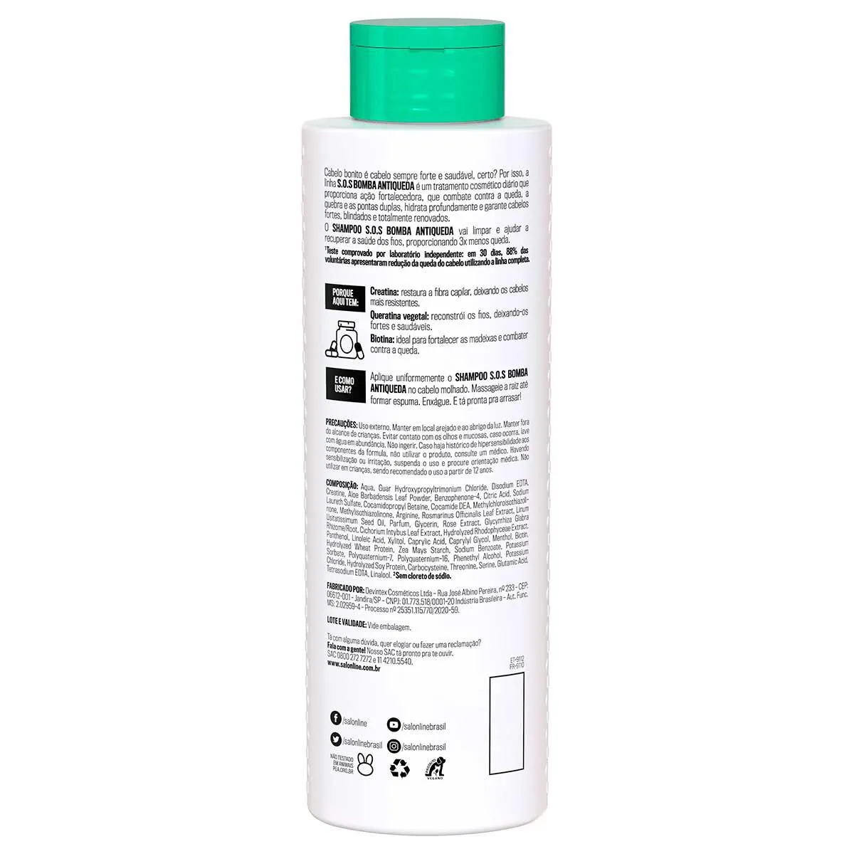 O Shampoo S.O.S Bomba Antiqueda conta com fórmula exclusiva e dermatologicamente testada. Seus ativos garantem o fim da queda de cabelo, crescimento capilar comprovado em 15 dias, além de cabelos mais fortes e saudáveis.