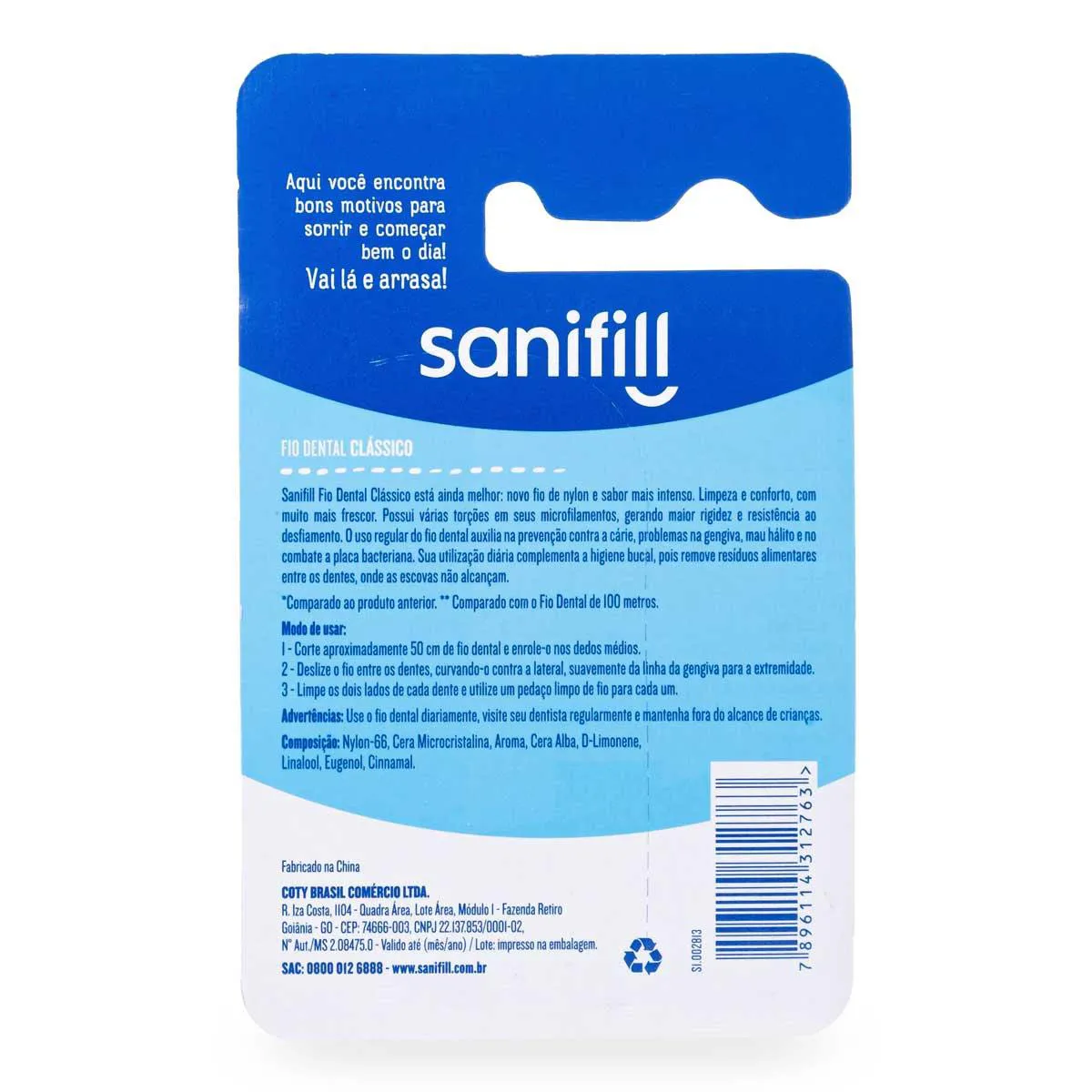 O Fio Dental Sanifill é resistente ao desfiamento, graças às torções em microfilamentos, e proporciona maior conforto e frescor na limpeza.