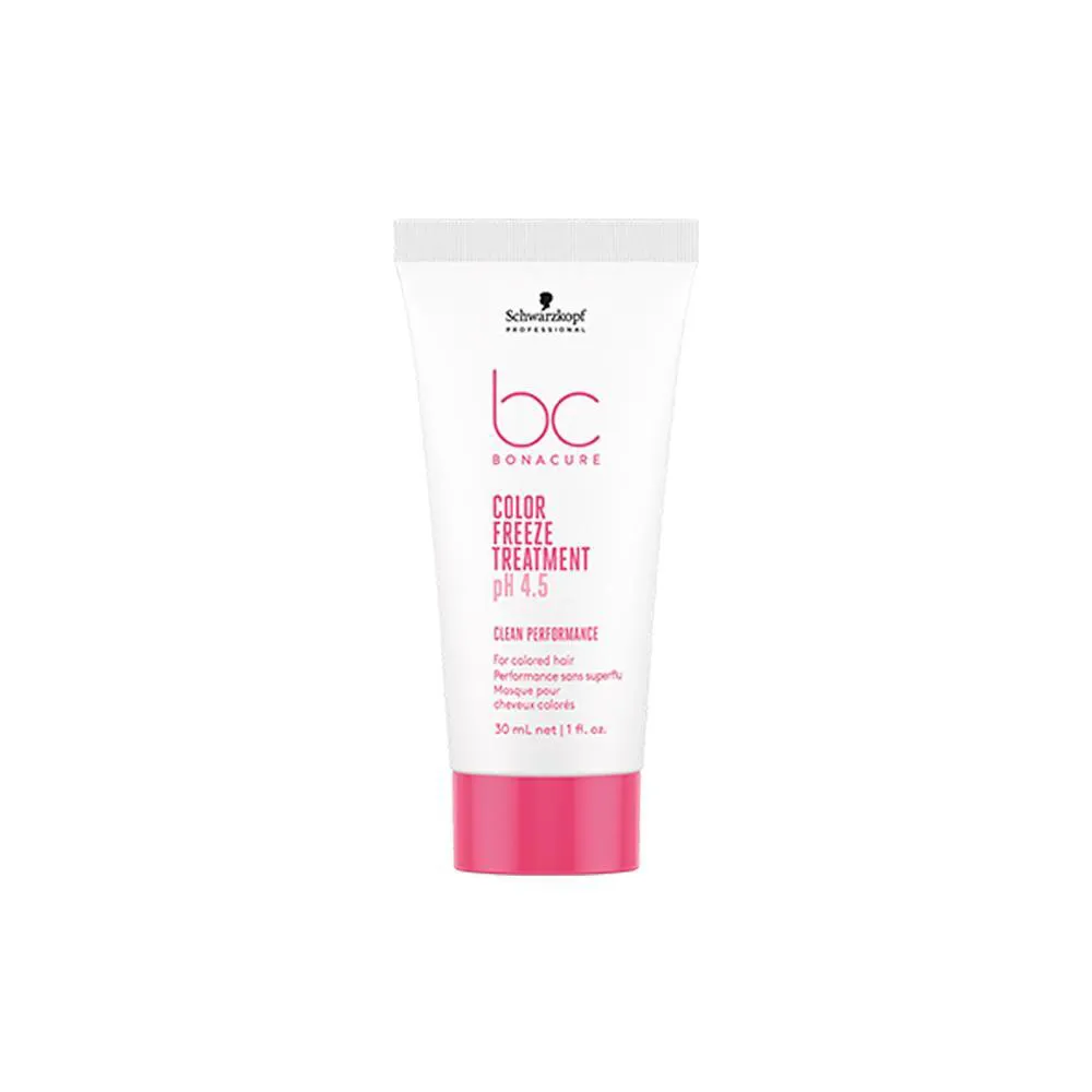 Máscara para Cuidado da Cor Brilho Schwarzkopf Professional BC Bonacure Color Freeze promove cuidado profundo para reparar intensamente os cabelos coloridos e traz de volta o nível de pH ideal de 4.5 aos fios. Ajuda a reduzir o frizz e suaviza a superfície do cabelo, além de adicionar brilho para uma cor vibrante e duradoura. A linha Color Freeze para cabelos coloridos reequilibra a estrutura do cabelo para um nível de pH ideal e protege a cor do cabelo, evitando o desbotamento. * RESULTADO: Cuidado da Cor * SUGESTÕES DE USO: 1.Aplique a máscara após a lavagem com o shampoo; 2.Distribua mecha por mecha; 3.Deixe agir de 3 a 5 minutos; 4.Finalize enxaguando abundantemente. * OBSERVAÇÕES: Imagem Meramente Ilustrativa * ITENS INCLUSOS: 1 Schwarzkopf Professional BC Bonacure Color Freeze Máscara para Cuidado da Cor 30ml