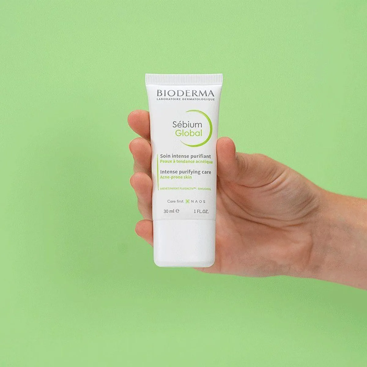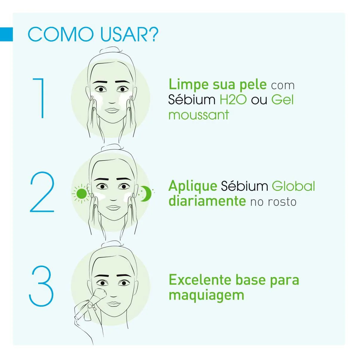 Sébium Global é um hidratante facial que atua diretamente nas causas e consequências da acne severa. Sua fórmula conta com ingredientes como zinco, enoxolona, glicerina e ésteres de AHA que promovem o efeito hidratante e acalmam a vermelhidão.